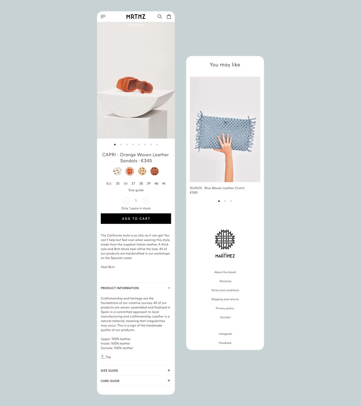 D.A. et design graphique du Shopify de la marque Martinez. Suivi de fabrication. Maintenance graphique et CSS.