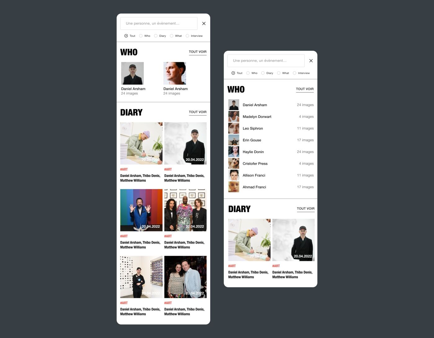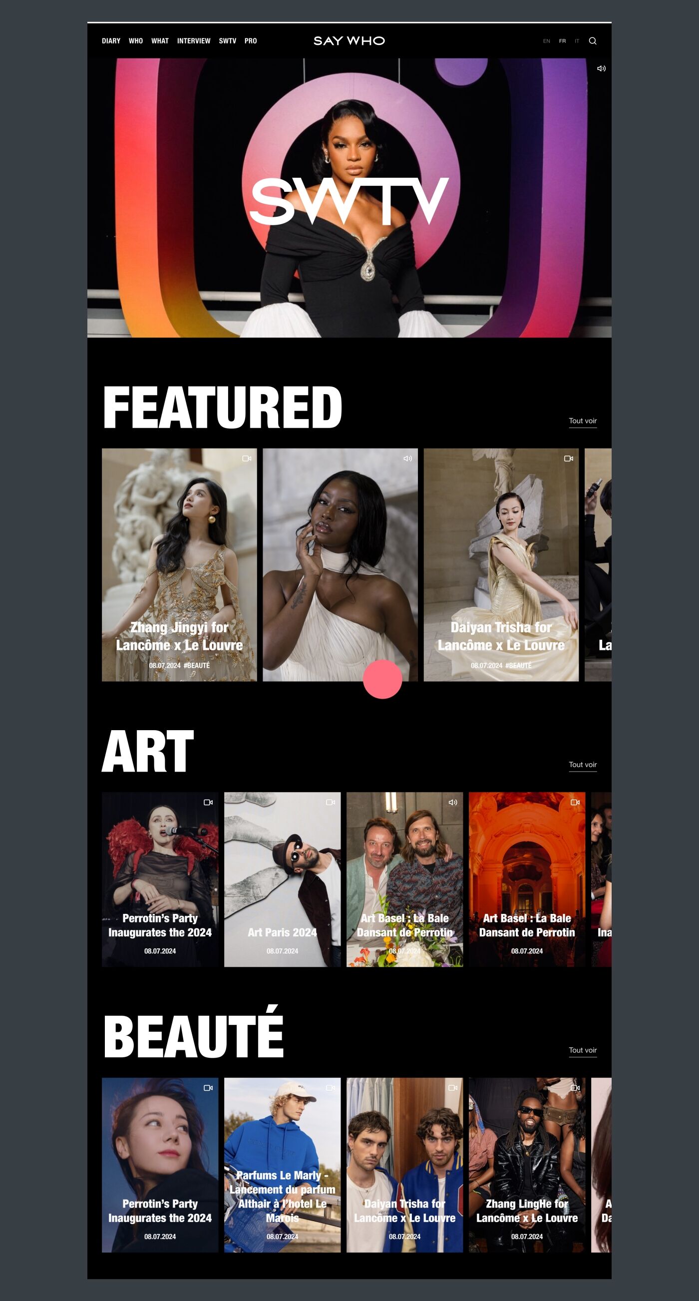 Fine tuning graphique+UX du site saywho.fr (home page), D.A. des autres pages présentées ci dessous : UI+UX du moteur de recherche, des pages portrait, suivi de production, maintenance graphique.