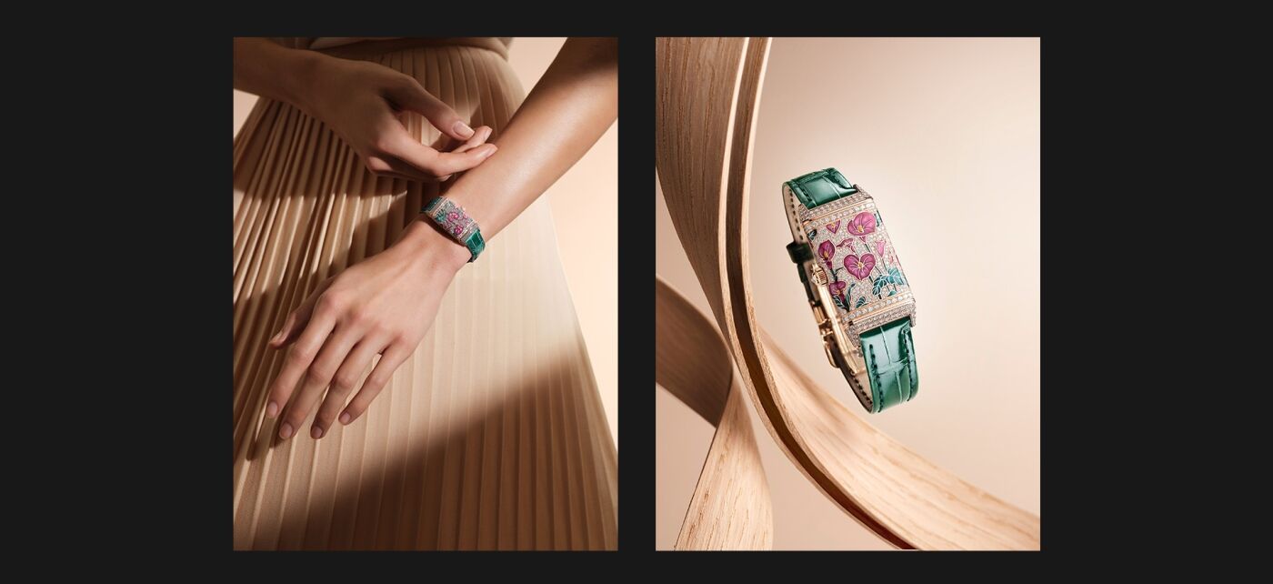 Structured lines and nature meet in the visual identity of the Reverso Precious Flowers collection.