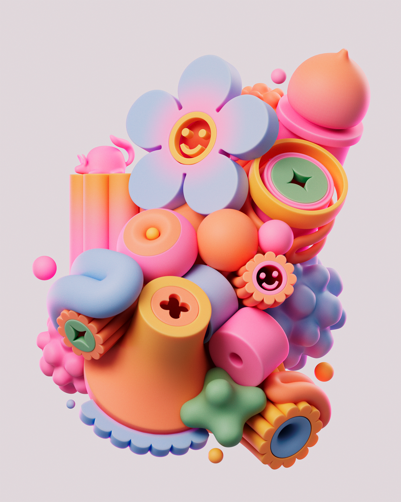 Siddhant Jaokar aka Hyperthalamuscorp is a digital artist based in Mumbai. Trained in the art of 3D during his industrial designer experience, Siddhant rapidly used his technical skills to materialize the universe inside his mind. Funny shapes, plastic materials and pastel colors are magnified by the high level of his nearly realistic 3D renderings. The result is an unexpected collection of visual compositions made of playful and abstract objects.