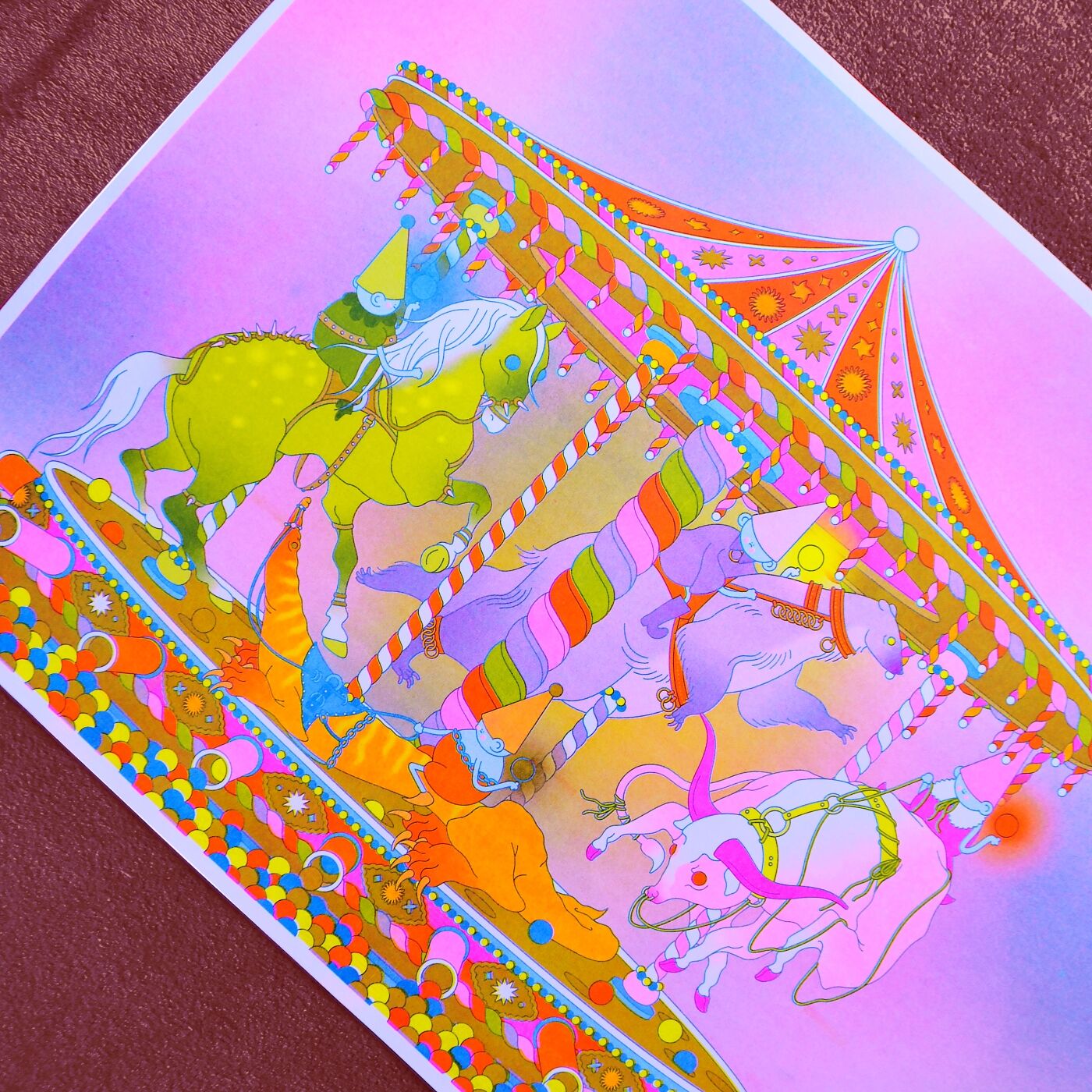 Alice Monvaillier's ultra-colorful pop style plays with the absurd. The world she creates is sweet and subversive at the same time, playing on the contrast between the apparent sweetness of the characters and their quirky, mischievous attitude, with their round eyes as if caught in the act of indulgence. But we can’t talk about Alice's style, abundant, unique, and humorous, without mentioning her passion, the risography. With a textured effect and a limited yet striking palette, risographs strengthen the distinctive and playful identity of her work.