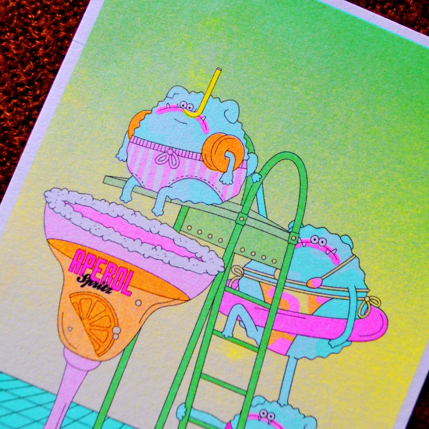 Alice Monvaillier's ultra-colorful pop style plays with the absurd. The world she creates is sweet and subversive at the same time, playing on the contrast between the apparent sweetness of the characters and their quirky, mischievous attitude, with their round eyes as if caught in the act of indulgence. But we can’t talk about Alice's style, abundant, unique, and humorous, without mentioning her passion, the risography. With a textured effect and a limited yet striking palette, risographs strengthen the distinctive and playful identity of her work.