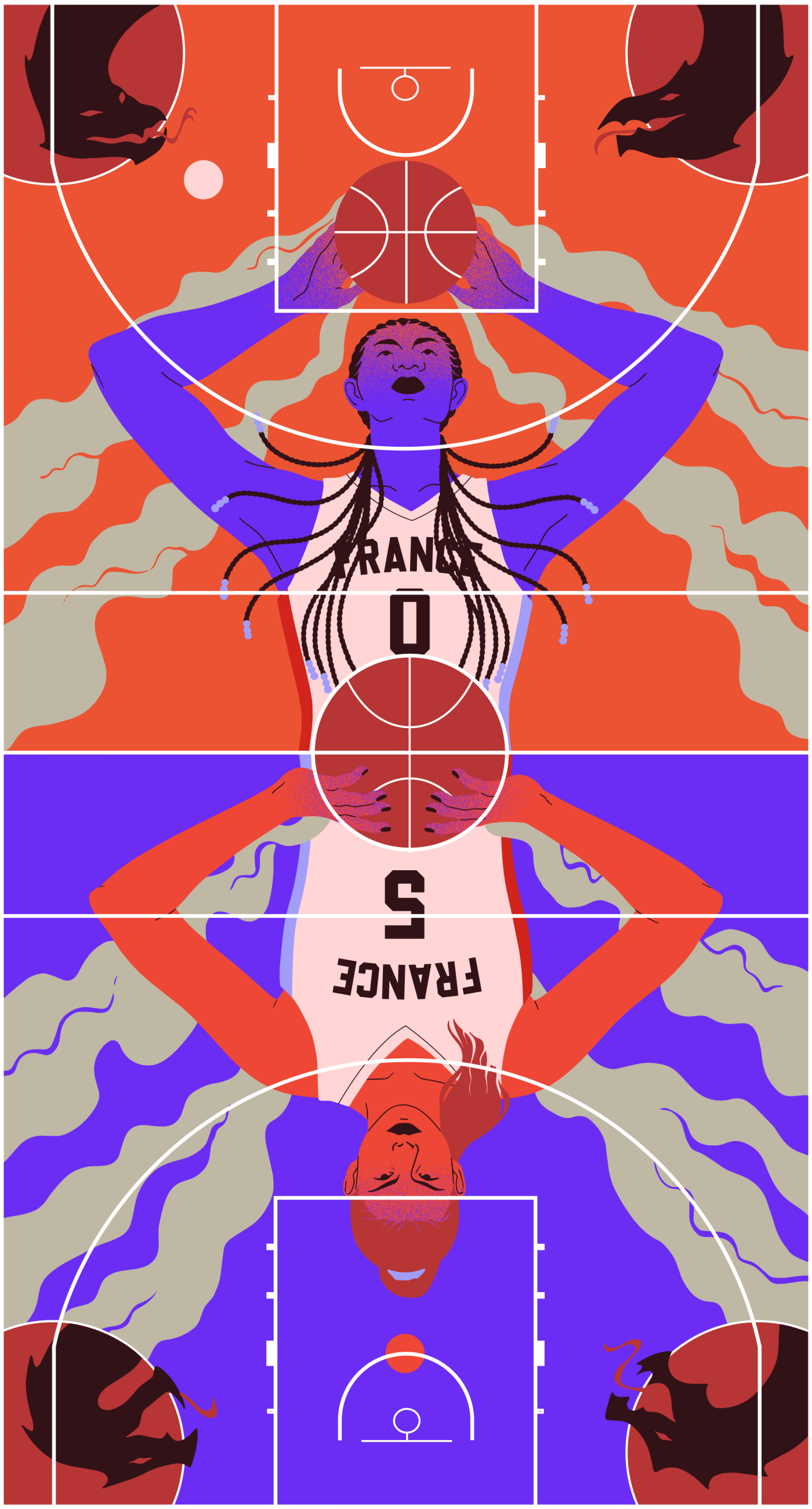 Design of a basketball court in Paris featuring World Champion 3x3 basketball players Marie-Eve Paget & Anna Ngo Njock commissioned by the city of Paris in the 18ème arrondissement.