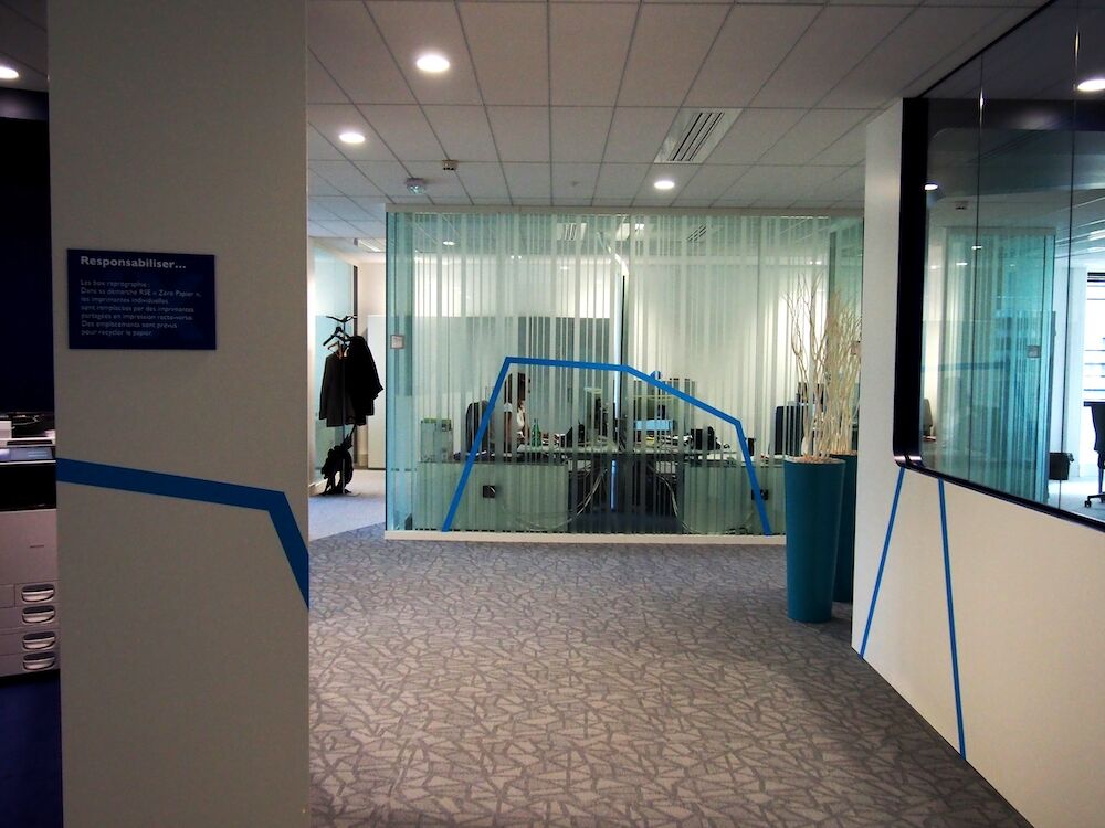 Création d'un fil d'Ariane aux couleurs de la banque dans l'ensemble du bâtiment pour la visite de soirée d'inauguration des nouveaux locaux du siège social.