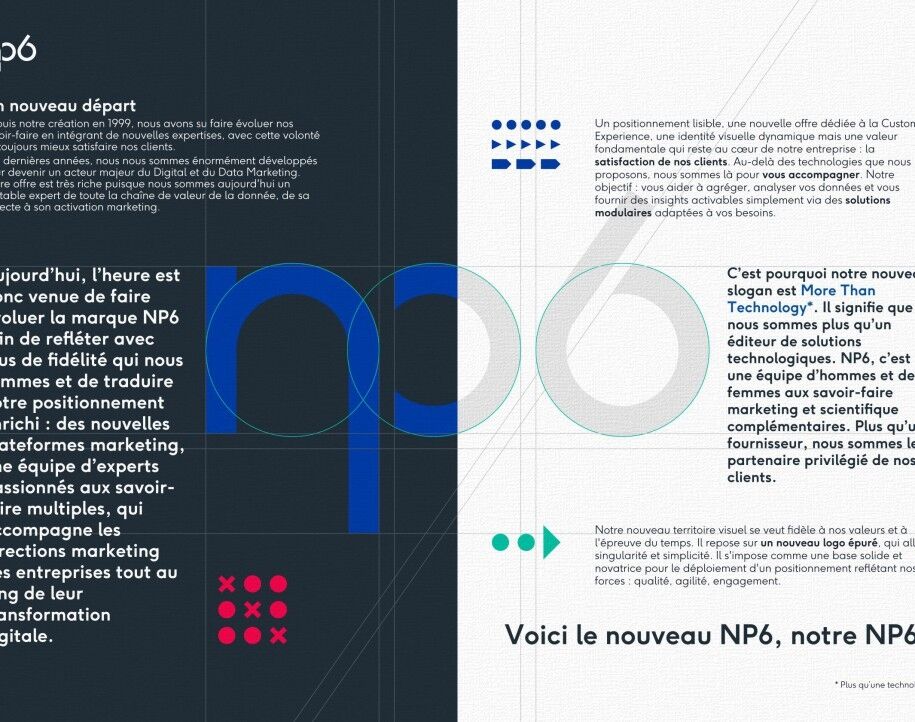 NP6 est une société technologique française créée à la fin des années 1990, éditrice de la célèbre solution d’emailing MailPerformance. Ayant connu une évolution significative depuis sa genèse, le groupe basé à Bordeaux, Paris et Londres est aujourd’hui à la croisée des chemins entre marketing, études et sciences de l’information. Leur vision est d’aider les entreprises à engager une relation personnelle avec chacun de leur client, dans un monde où la digitalisation des données s’impose comme un fait hégémonique. Editeur de plateformes technologiques extrêmement avancées, NP6 aide de nombreux grands groupes et PME à accroître leur degré de connaissance client, et d’engager des campagnes d’activation pertinentes et efficaces. C’est suite aux acquisitions de l’expert en data intelligence Socio Logiciels et de la startup française Ezakus, ayant entraîné un repositionnement complet du groupe, que Brand Brothers a été choisi pour repenser l’identité globale du groupe et son branding print et digital.