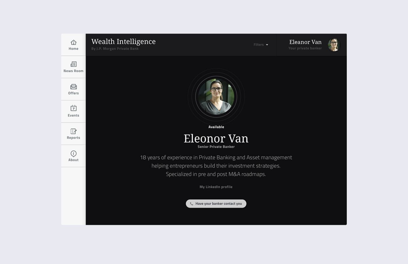 Between management and editorial, 'Wealth Intelligence' is a closed platform designed for J.P. Morgan customers. The goal is to guide and simplify relationships between users and bankers.