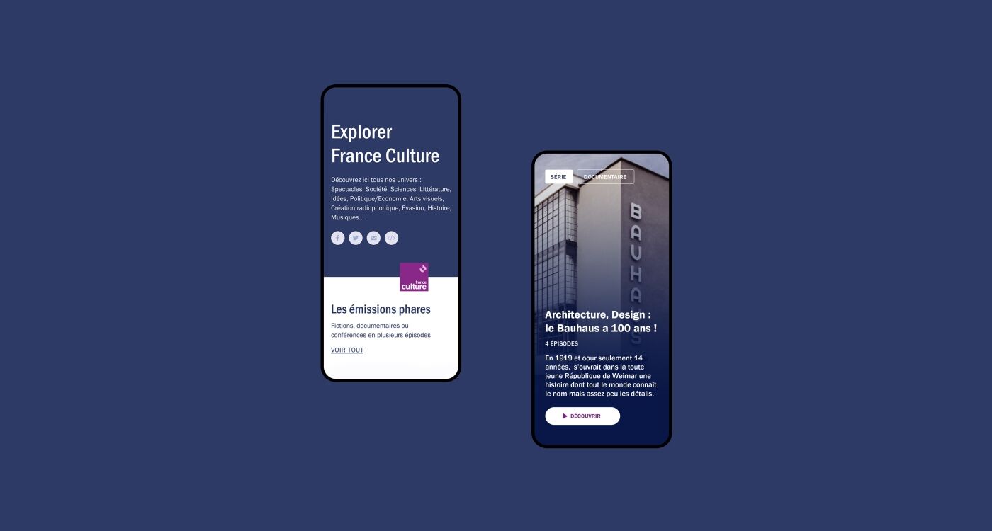 Réalisation d’interfaces pour France Culture sur le thème de la découvrabilité afin de donner à l’utilisateur de nouveaux chemins d’écoute autour de thématiques culturelles, de séries et d’émissions.