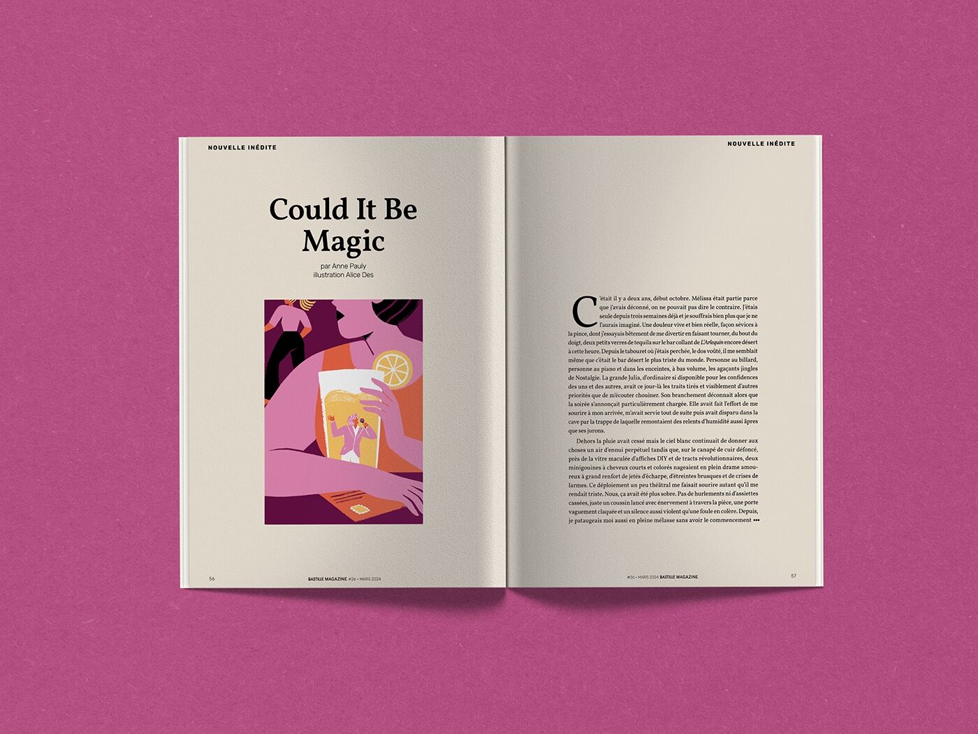 Illustration d'une nouvelle "Could It Be Magic" d'Anne Pauly, pour Bastille Magazine n°26, de mars 2024.