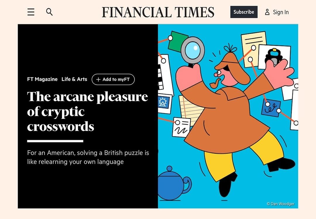 Illustration for the Financial Times Weekend about the tricky but addictive world of cryptic crosswords.
