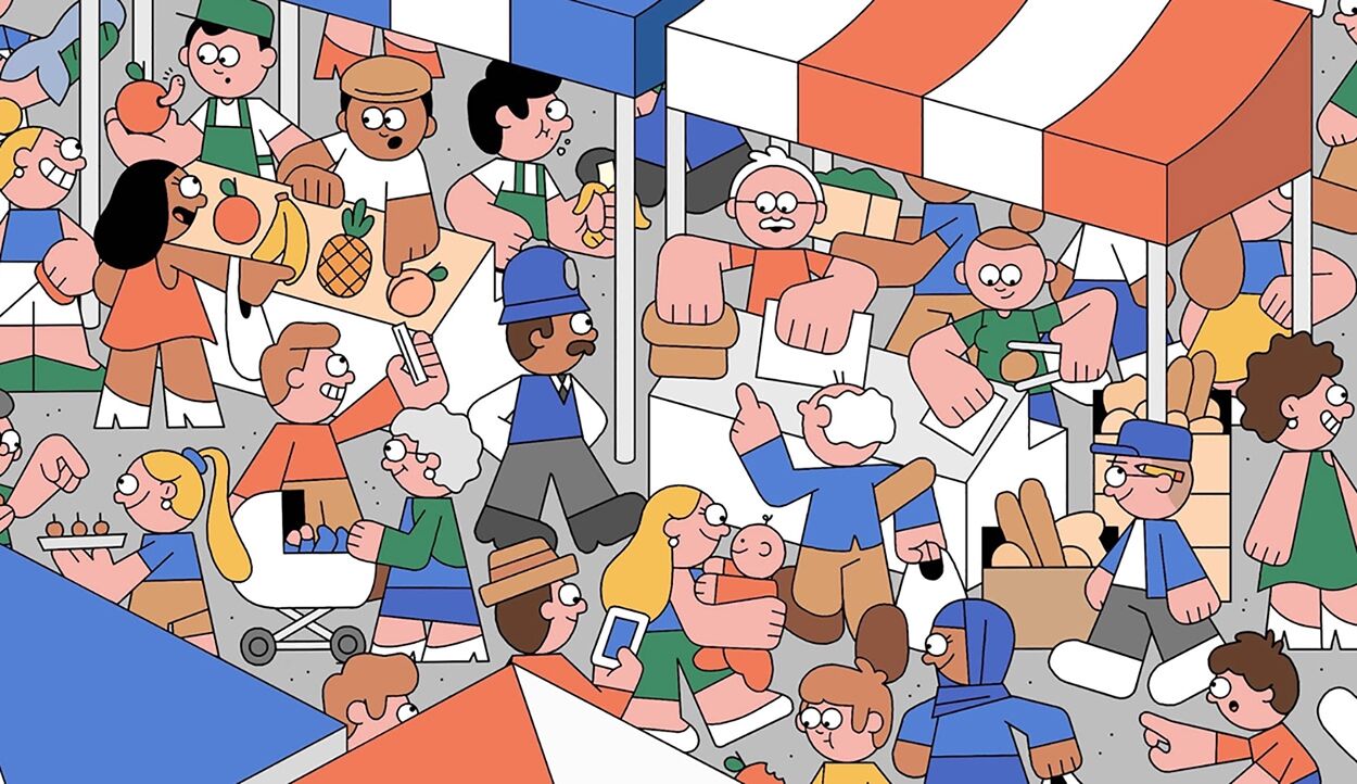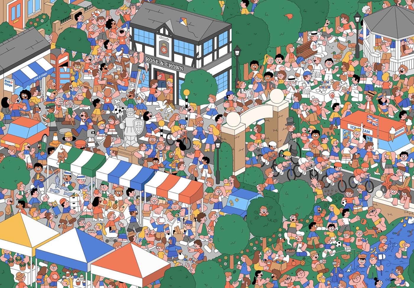 Ne cherchez plus Dan Woodger, nous l'avons trouvé ! Et ça n'a pas été simple de le repérer au milieu de cette foule incroyablement dense. L'art de Dan est d'emboîter ensemble différentes scènes de vie pour ne former qu'un tout. Comme s'il souhaitait nous raconter le monde entier en une seule image. Très inspirée de l'univers graphique des Simpson, colorée comme le sont les Dragibus®, l'illustration de Dan nous offre l'occasion de ne jamais grandir et de continuer à s'émerveiller de tout.