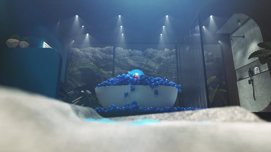 Instead, it becomes a lively place, its reality deconstructed offering a fantasized vision of isolation. Between hallucination and frustration the space stretches, the limits blur, and the objects switch their primary function. The house is gradually covered in blue, the very color of the mask that marks the passing of time and the change in lifestyle that it generates.