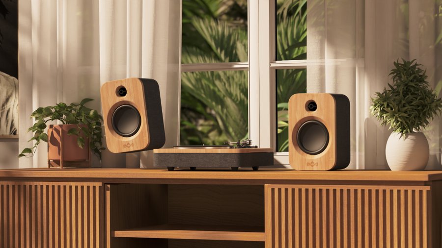 Get Together Duo are bookshelf-style speakers from The House Of Marley, capturing their signature style with materials that make a difference to the footprint they leave behind on Mother Earth. Get Together Duo is crafted from bamboo and REWIND® Fabric.