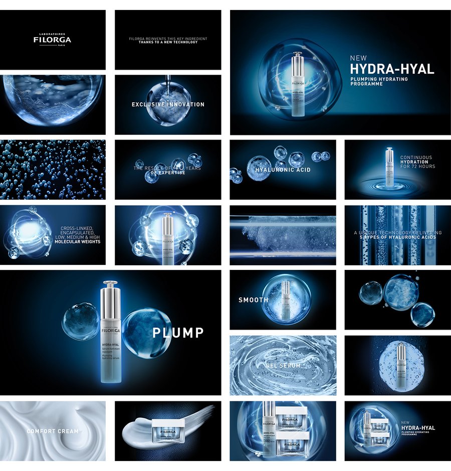 StoryBoard pour le film produit, illustrant l'action hydratante et repulpante.