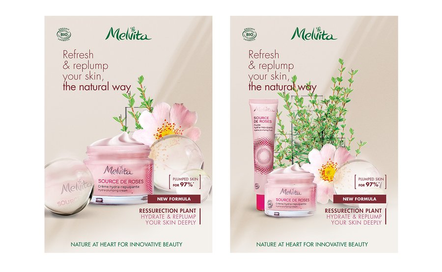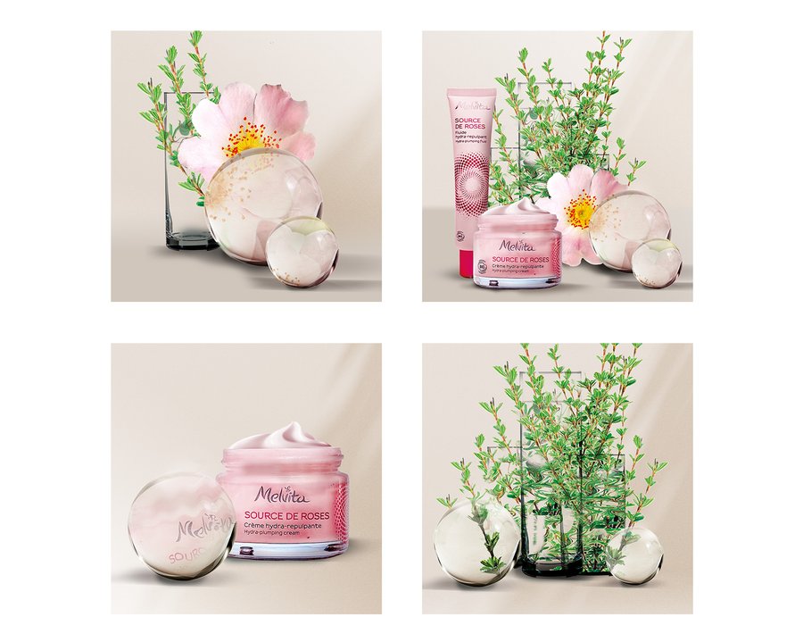 Contenus autour de la gamme 'Source de Roses' : maquettes d'intention de shooting pour les posts Instagram, storyboard film produits, annonce presse...