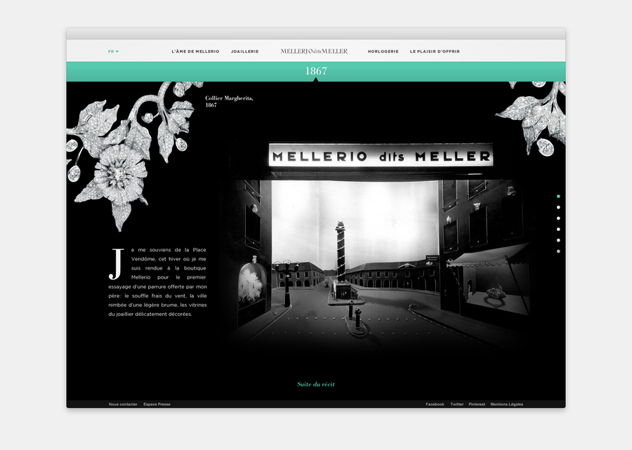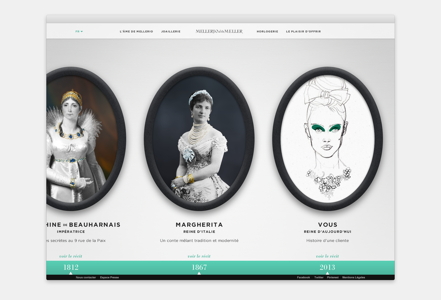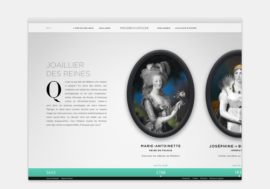 Proposition conceptuelle et graphique pour le site web du joaillier Mellerio. L'histoire de la Maison est racontée par 4 reines emblématiques (et clientes du joaillier) de diverses époques : Marie-Antoinette, Joséphine de Beauharnais, Margherita et «Vous», la reine d'aujourd'hui. Collaboration avec Les Navigauteurs / Soyuz.