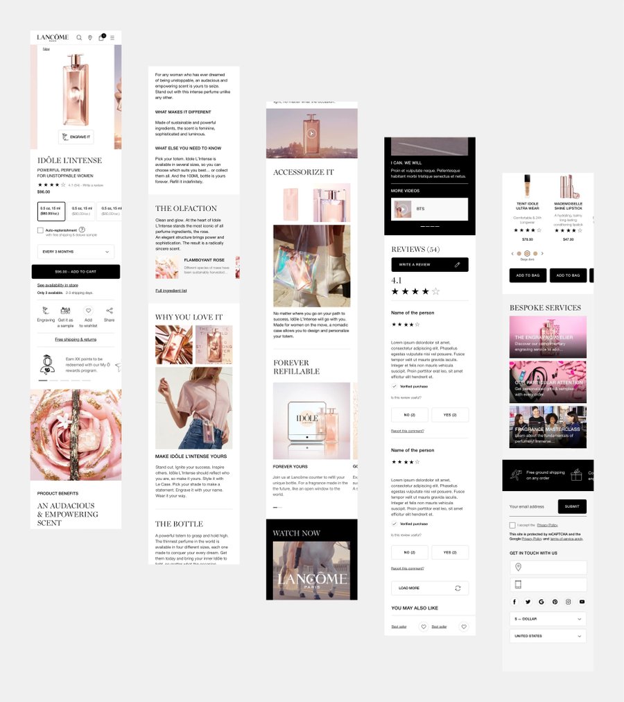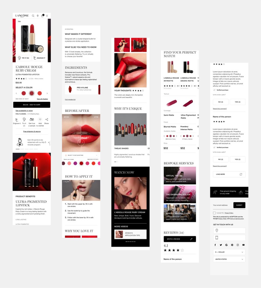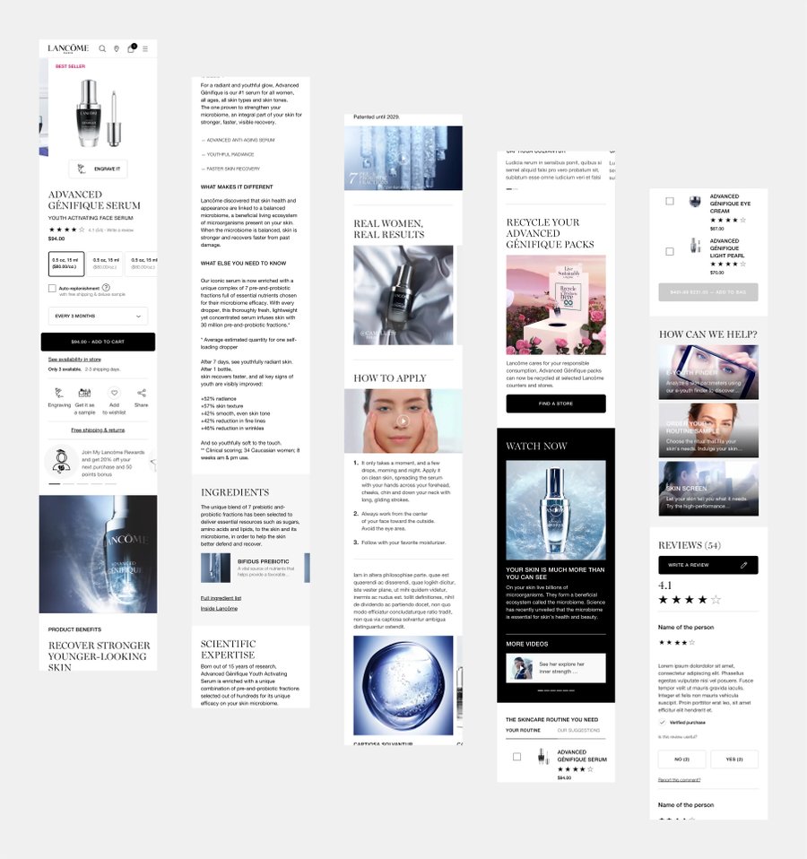 Création de pages produits détaillées modulaires du nouveau site Lancôme. Template applicable sur le skincare, makeup et fragrance.