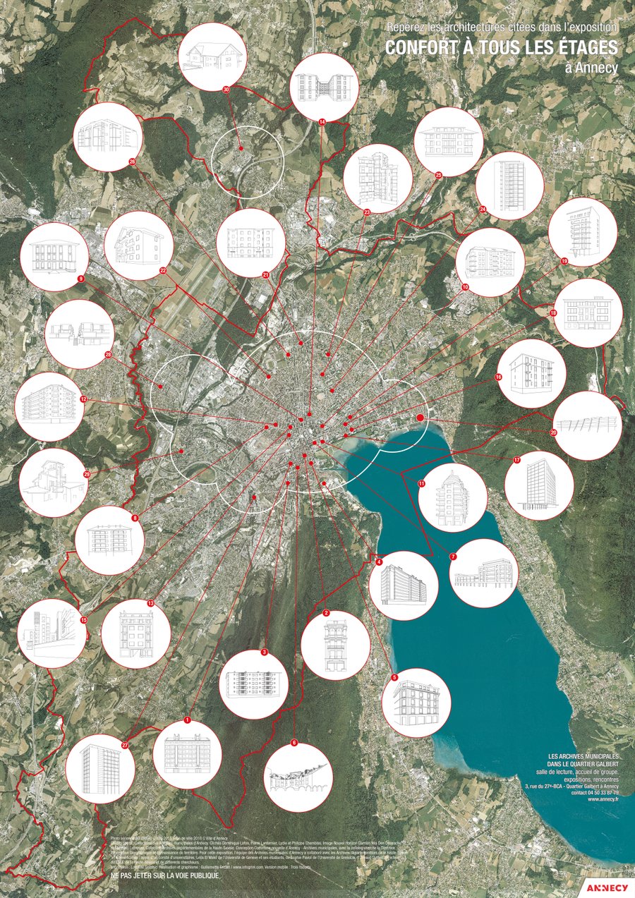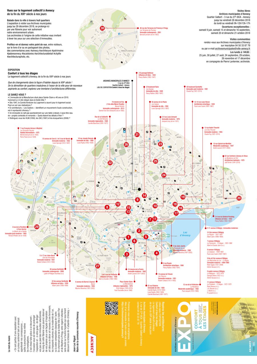 Dépliant pour aller déambuler dans la ville d'Annecy et voir sur site les bâtiments remarquables présentés dans l'exposition Confort à tous les étages.