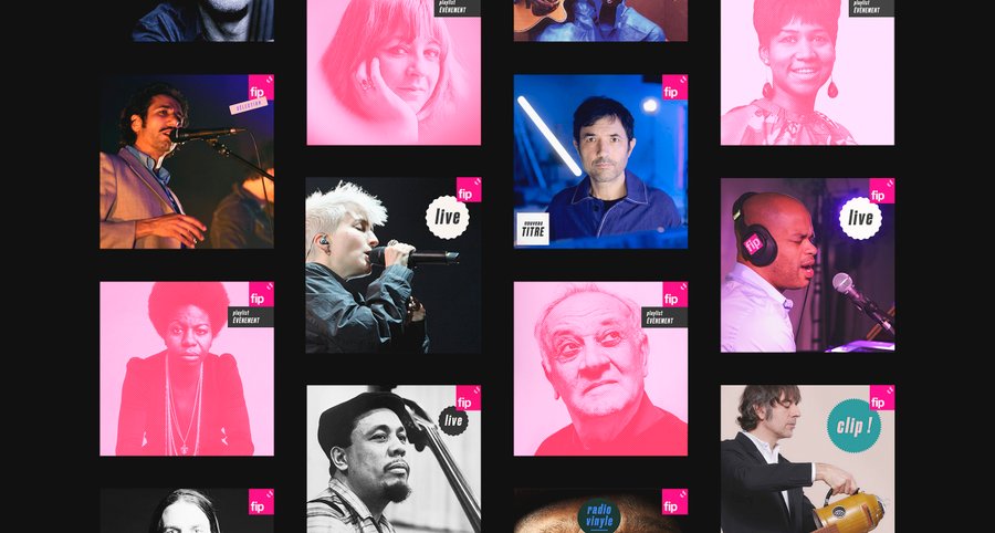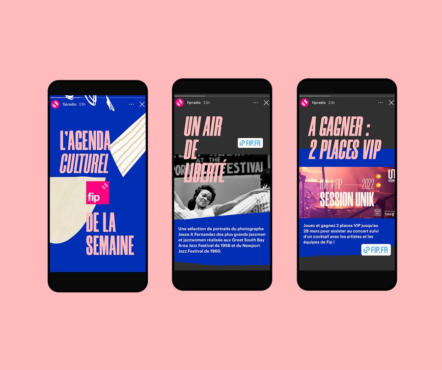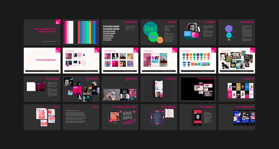 Création d’une bibliothèque partagée d’éléments graphiques réalisés sur mesure pour les réseaux sociaux de Fip. À partir d’un signifiant bien connu des collectionneurs de vinyle, les stickers, il s’agit de mieux identifier l’univers musical éclectique de Fip. Les stickers permettent une utilisation flexible et diversifiée de la signalétique, utilisable en fonction de leur forme, couleur ou thématique et ce, de façon unitaire ou multiple en les combinant si besoin.