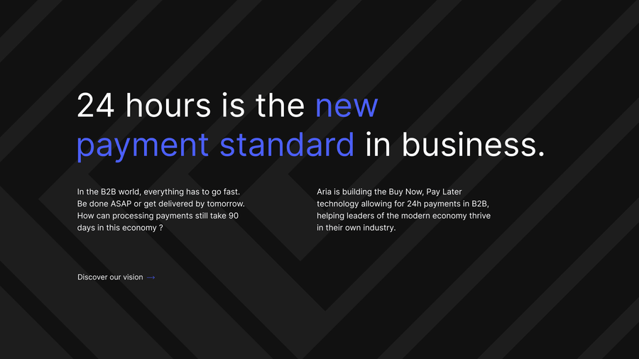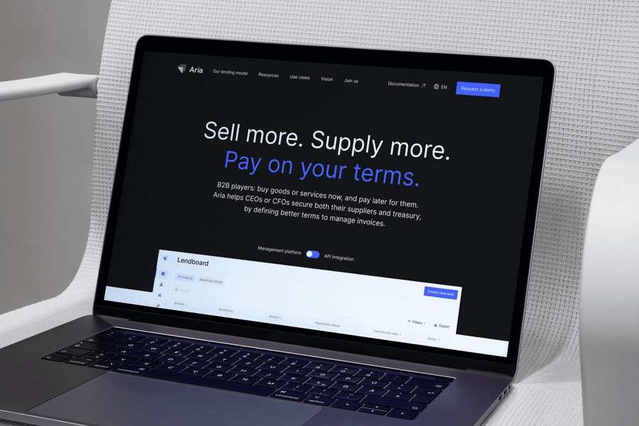 B2B players, buy goods or services now, and pay later for them. Aria helps marketplaces CEOs or CFOs secure both their suppliers and treasury, by defining better terms to manage invoices.