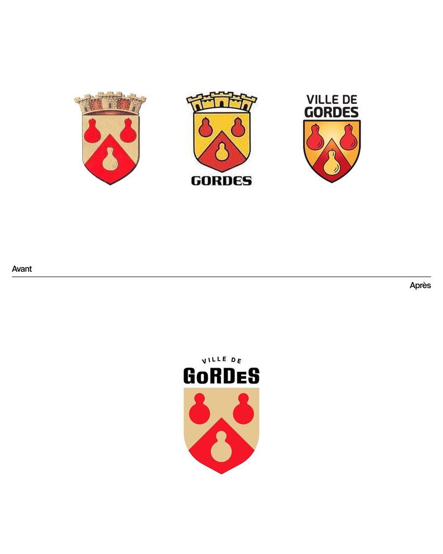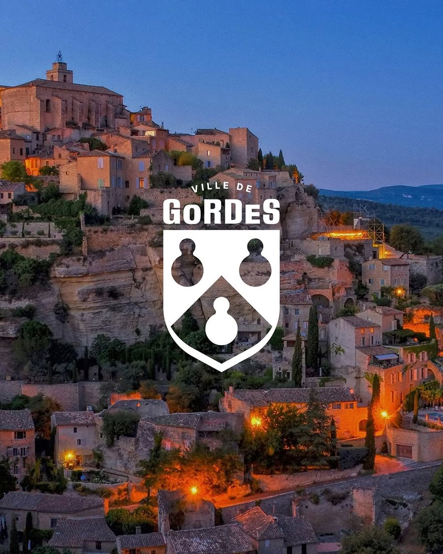 J’ai revisité le blason du village en le simplifiant : le jeu typographique sur GoRDeS rappelle les lignes du château. Les gourdes, symboles historiques, ont été adoucies et modernisées.