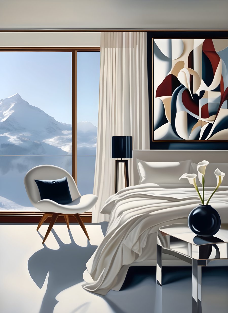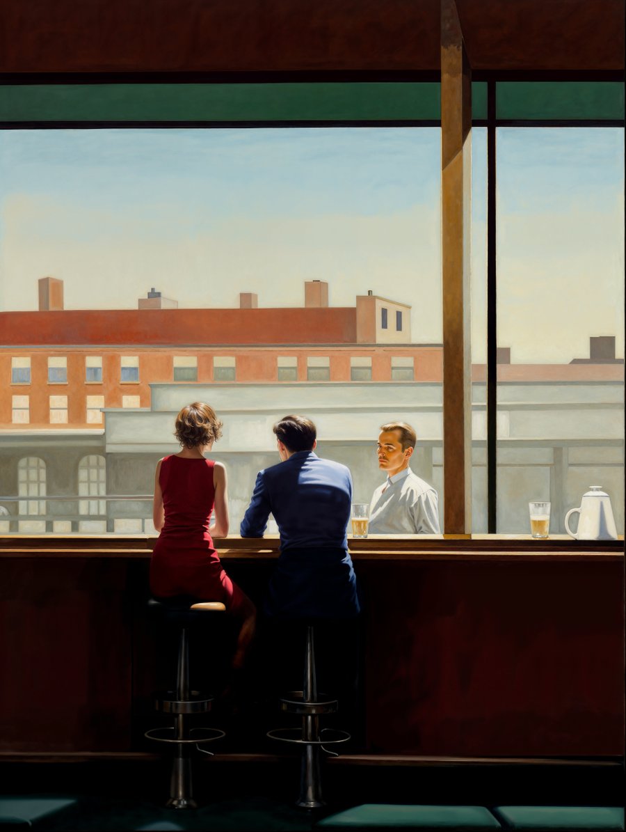L'image inspirée par Tamara De Lempicka se pare du style Art Déco, mettant en avant des textures détaillées dans les drapés, ainsi que les fleurs de lys emblématiques. Une toile abstraite évoque subtilement le travail artistique de Lempicka. Dans un autre visuel, les jeux de lumière et l'architecture s'inspirent de l'esthétique caractéristique d'Edward Hopper, offrant un regard renouvelé sur son célèbre tableau "Nighthawks".