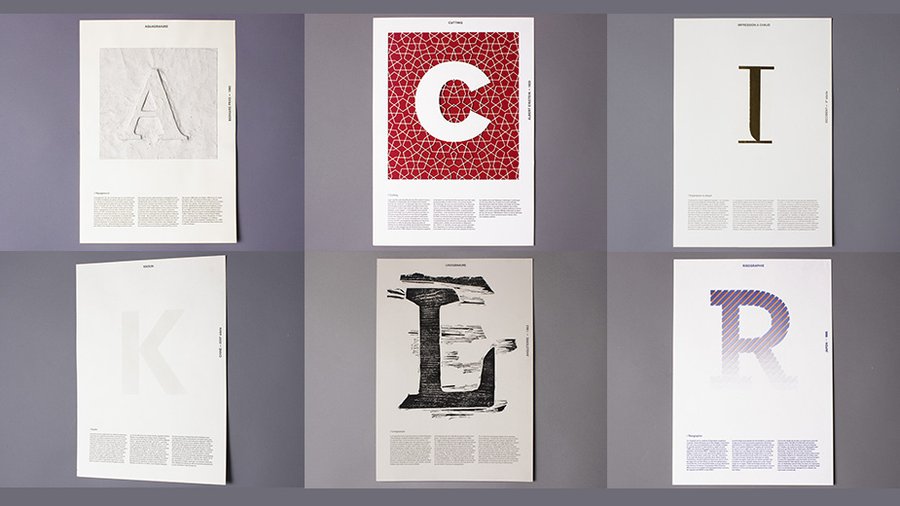 "L’abécédaire de l’impression" présente des affiches imprimées mettant en valeur des techniques, avec des détails historiques et descriptifs au bas de chaque affiche. Il s'agit d'une présentation informative des méthodes d'impression et de leur évolution.