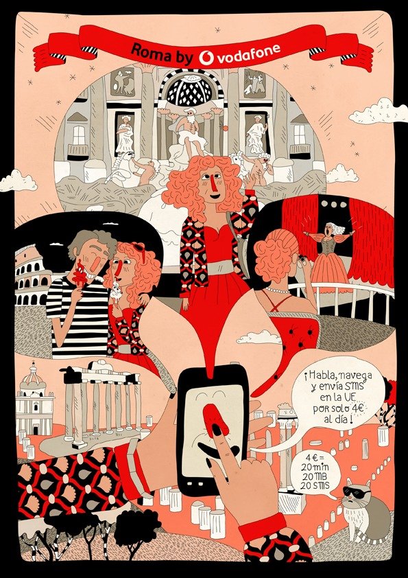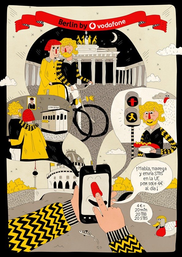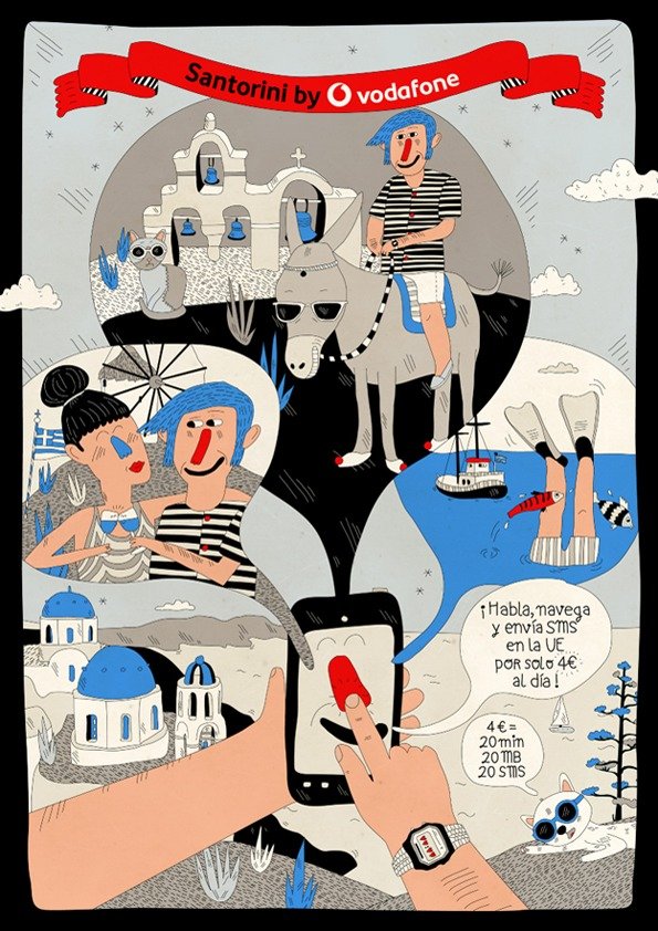 Illustrations pour Vodafone Espagne, parue dans Ling, le magazine de la compagnie aérienne Vueling. Chaque mois, Vodafone propose une nouvelle destination pour faire la promotion du roaming.
