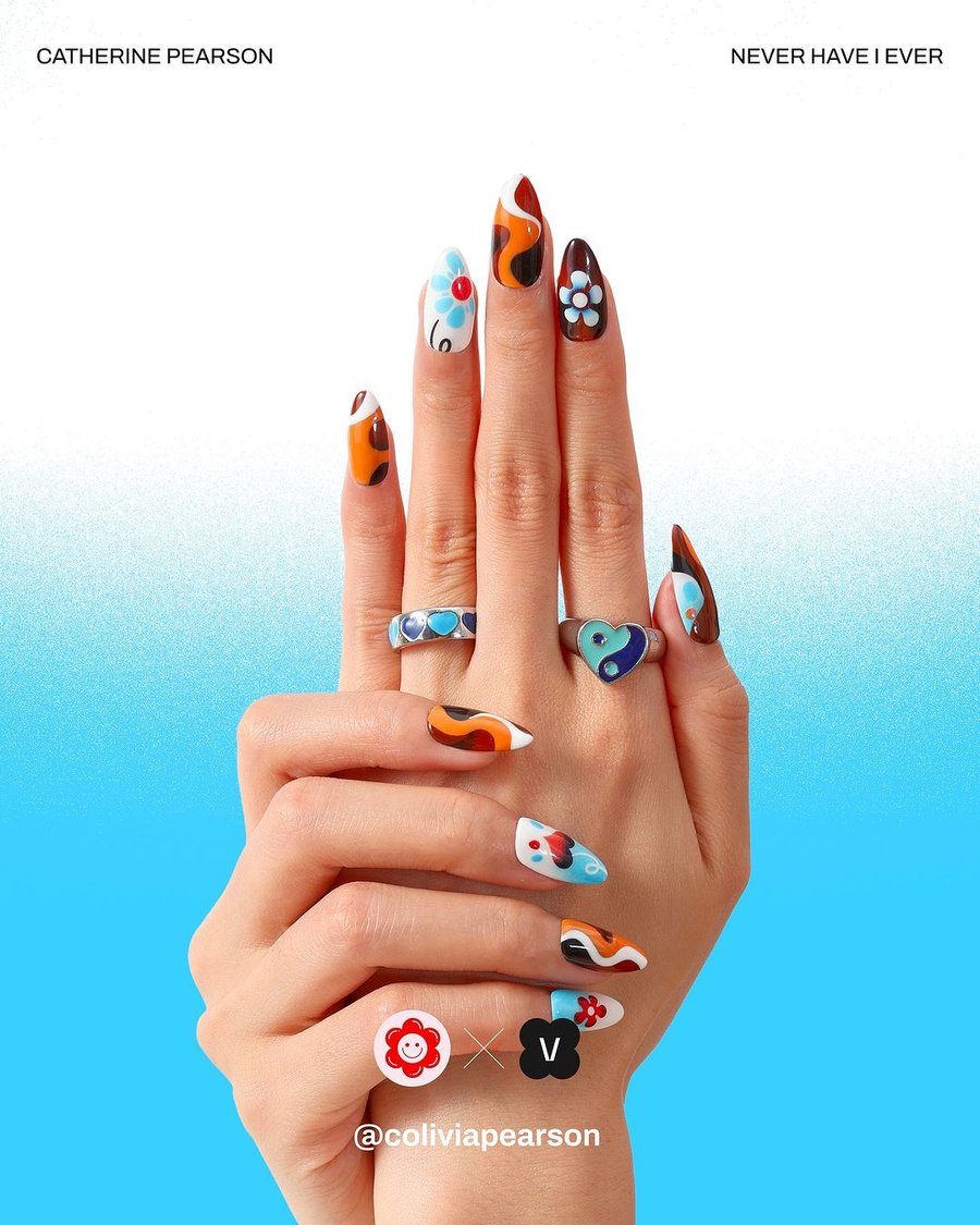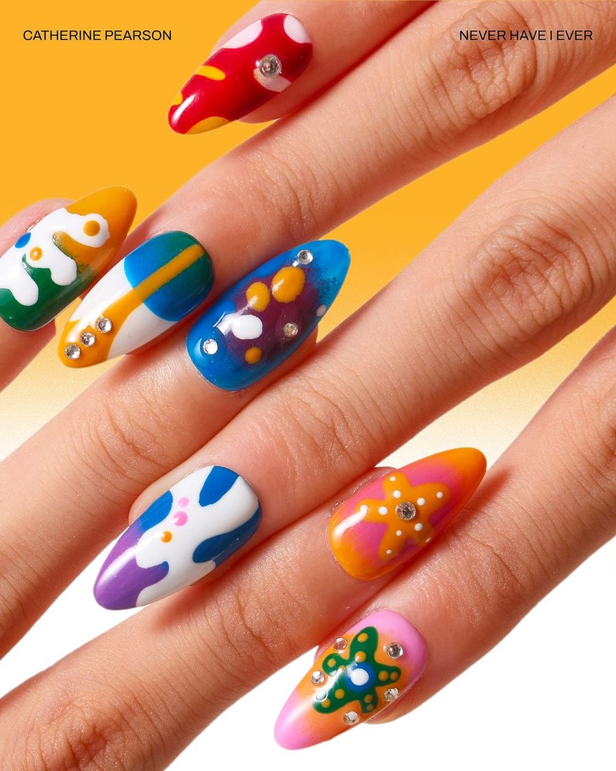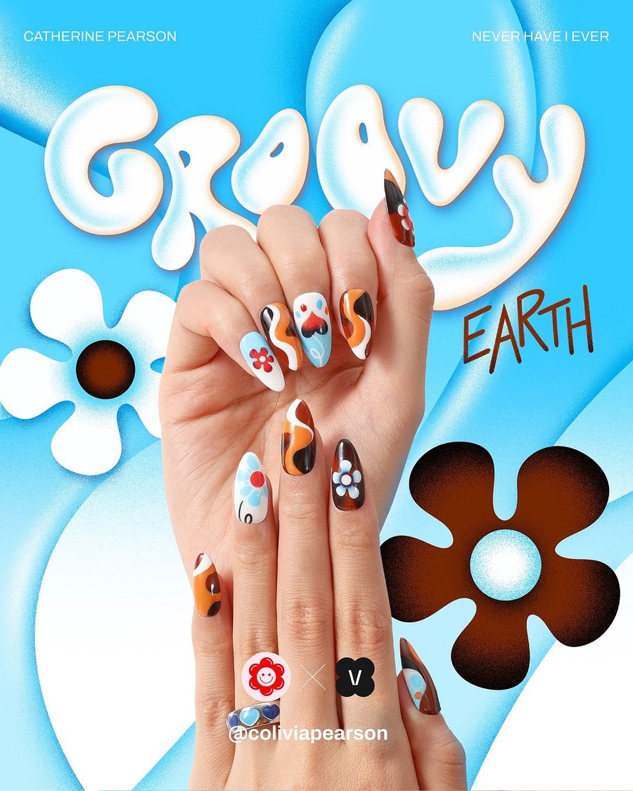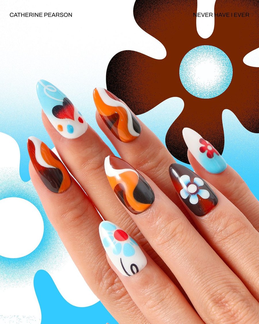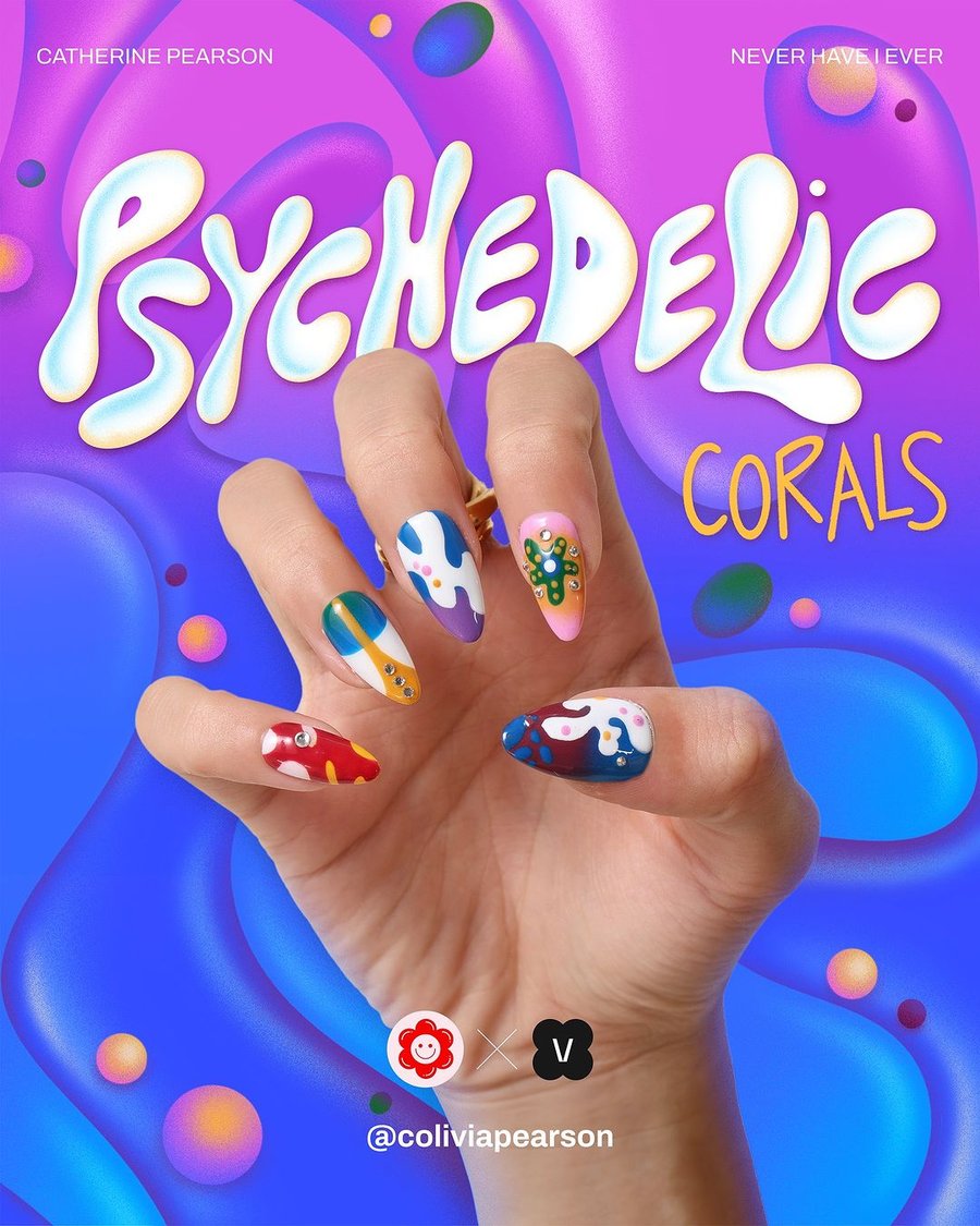 From this collaboration between illustrator Catherine Pearson and nails shop Never Have I Ever, 3 nail sets were created, featuring the illustrator's style as designs: Groovy Earth, Psychedelic Corals, and Burning Love.