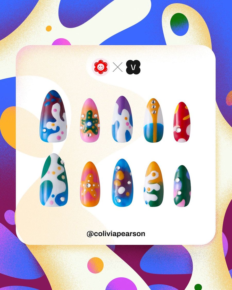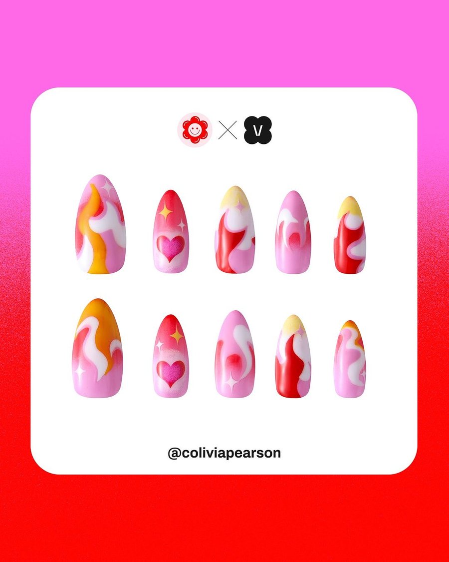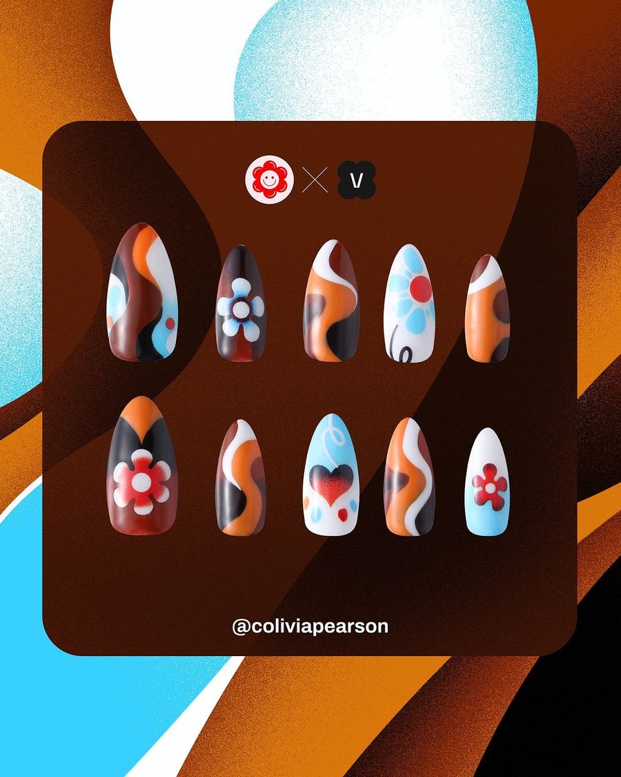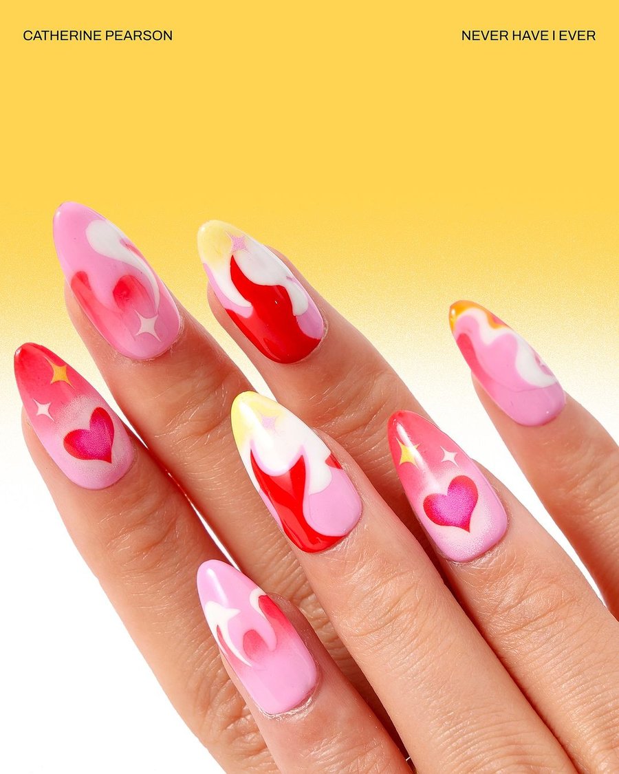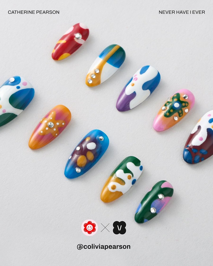 From this collaboration between illustrator Catherine Pearson and nails shop Never Have I Ever, 3 nail sets were created, featuring the illustrator's style as designs: Groovy Earth, Psychedelic Corals, and Burning Love.