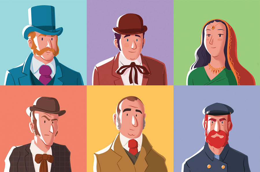 Illustration de la couverture, des doubles-pages et des personnages pour Le Tour du monde en quatre-vingts jours de Jules Verne.
