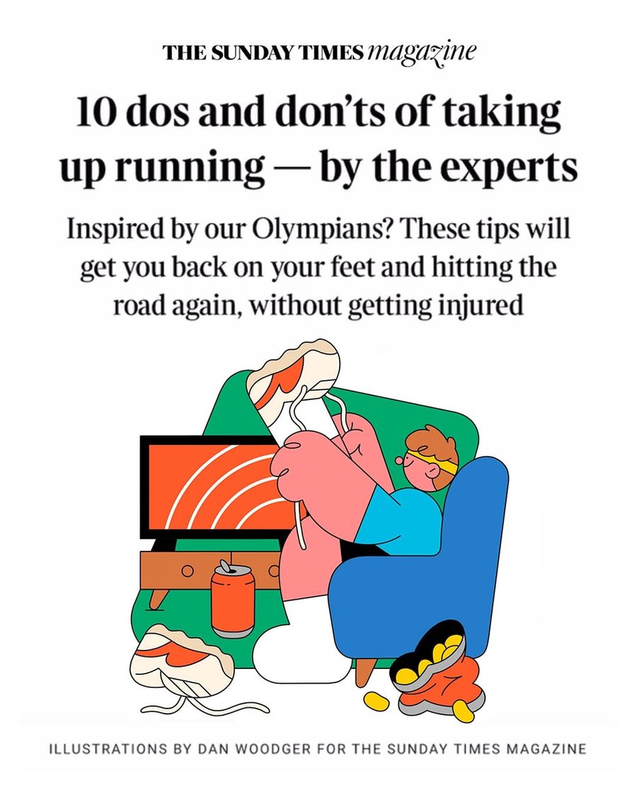 Animated illustrations for The Sunday Times magazine for an article on the dos and don’ts of starting a running journey, from fueling up to finding the perfect shoes.