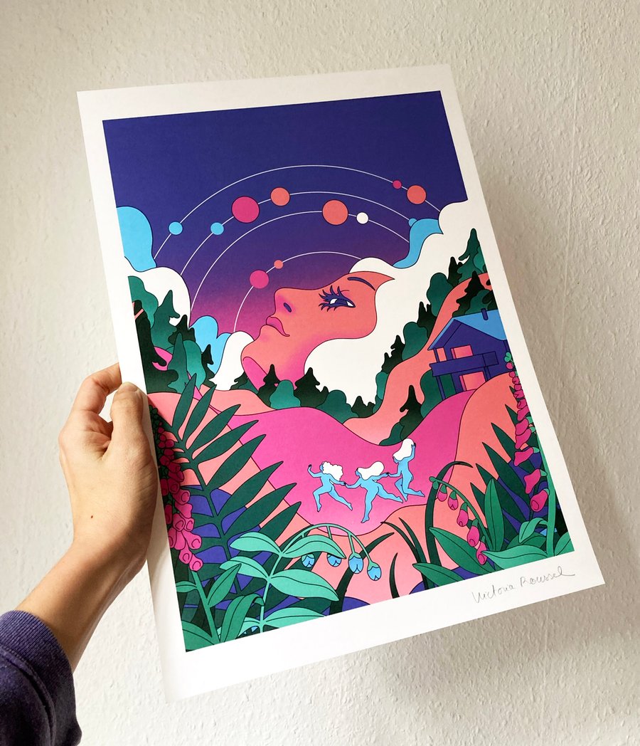 Fascinated by nature, mountain, exploration, hiking and climbing, Victoria carries with her a slight obsession for the cosmos and the mountainous reliefs. Her work displays her unconditional love for summits, bright sunset colours, enchanting natural landscapes, moonlight, and the vastness of starry skies. When this never-ending observation of nature combines to her always refining illustration skills, the result is often enchanted scenery, vivid scenery and dreamlike landscapes. This unique combination gave her the opportunity to apply her art on a vast array of media and to collaborate with agencies worldwide and clients from the like of Air France, La Maison du Chocolat, Le Musée des Confluences, Sidaction, AngelList and many more.