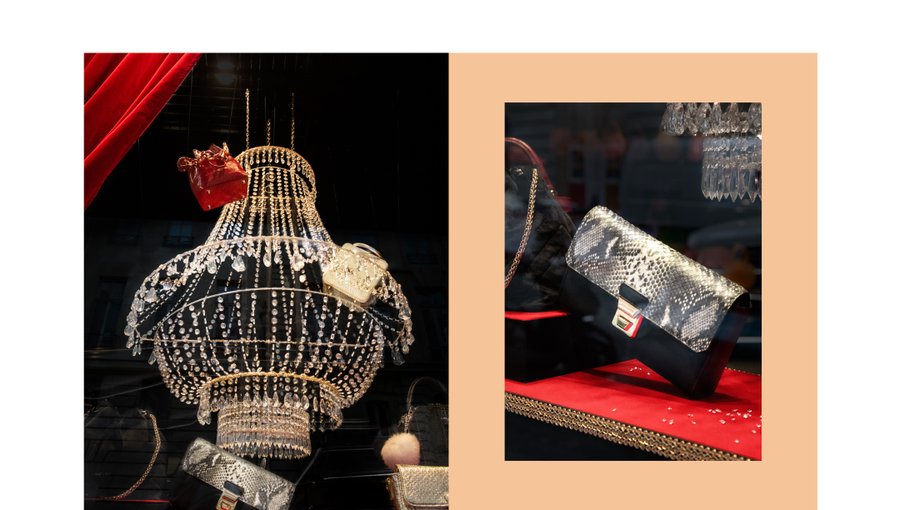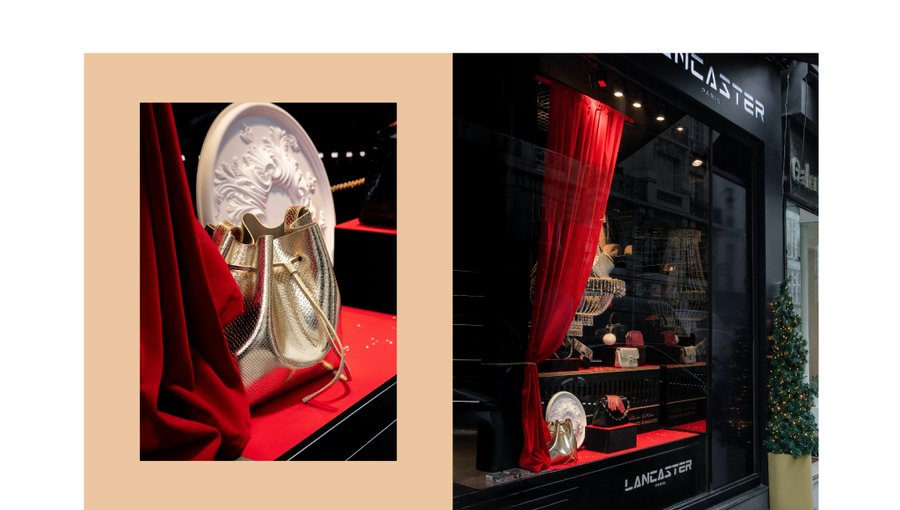 Mise en scène théâtrale avec de grands lustres centraux fabriqués à la main pour une présentation romanesque des sacs Lancaster pour les fêtes de fin d'années.