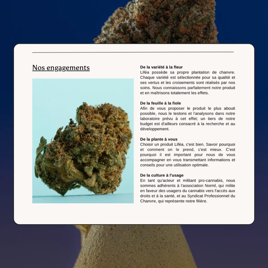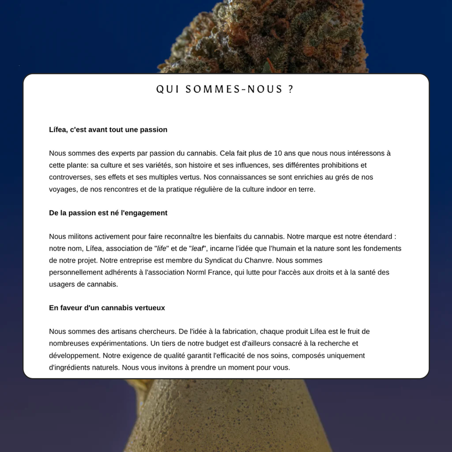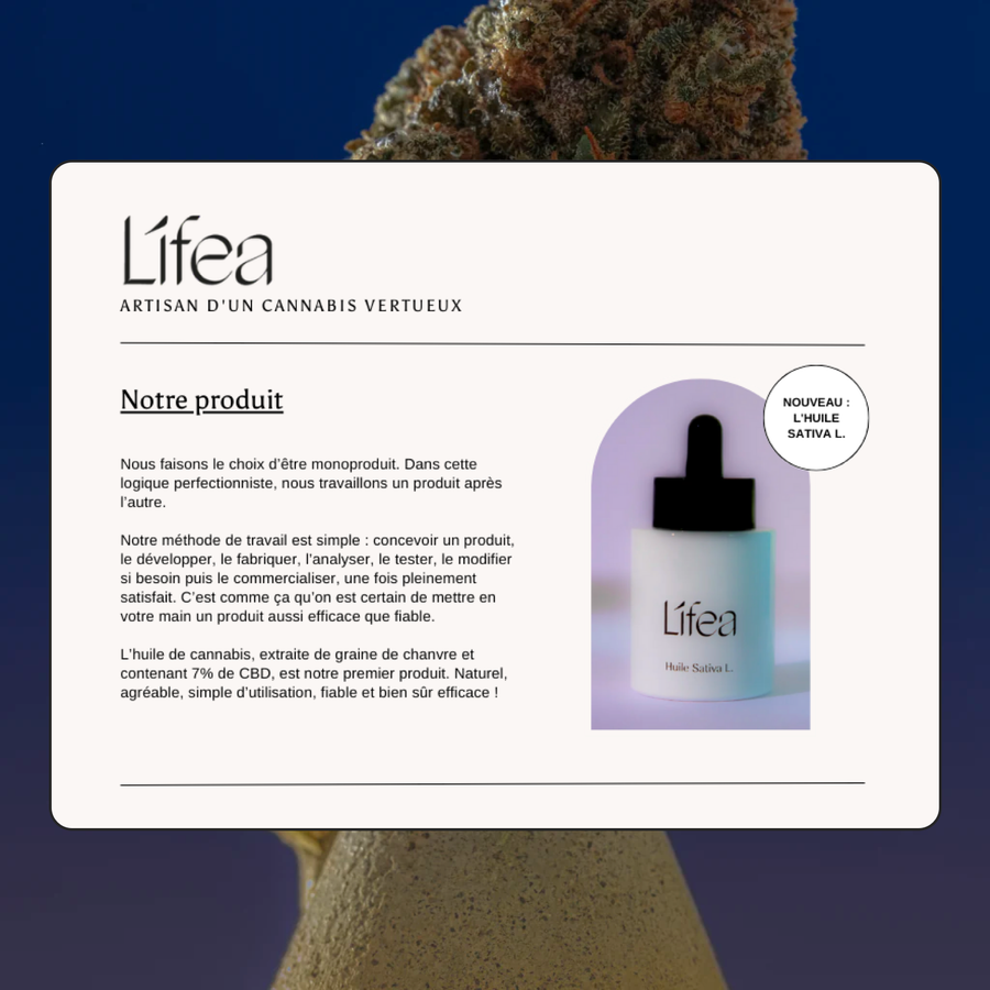 Liféa conçoit des produits naturels de qualité à base de CBD, pour faire profiter des bienfaits et des vertus thérapeutiques de cette plante.