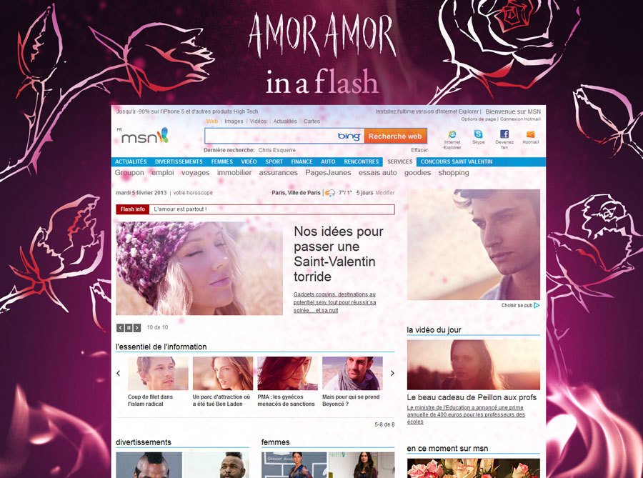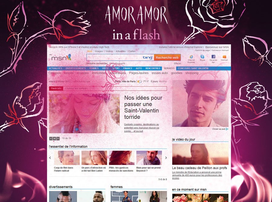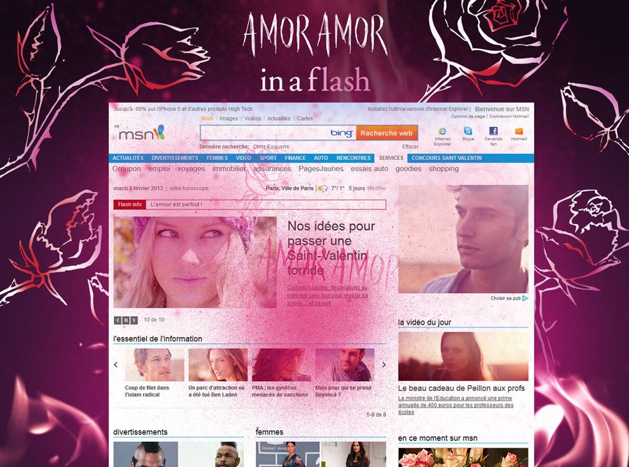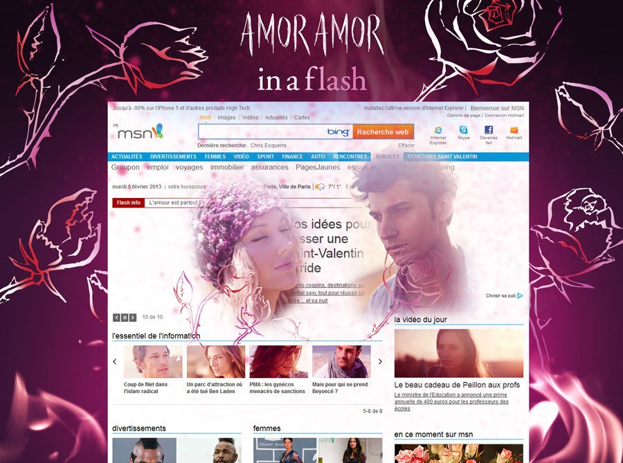 Conception rédaction d'un habillage digital pour le lancement du nouveau parfum Amor Amor in a Flash de Cacharel.