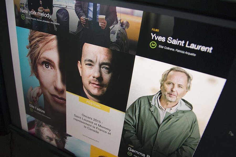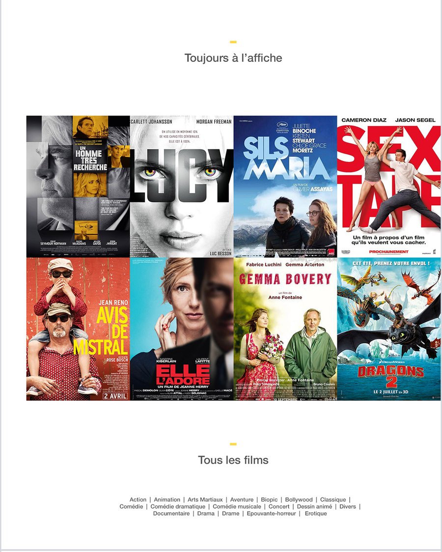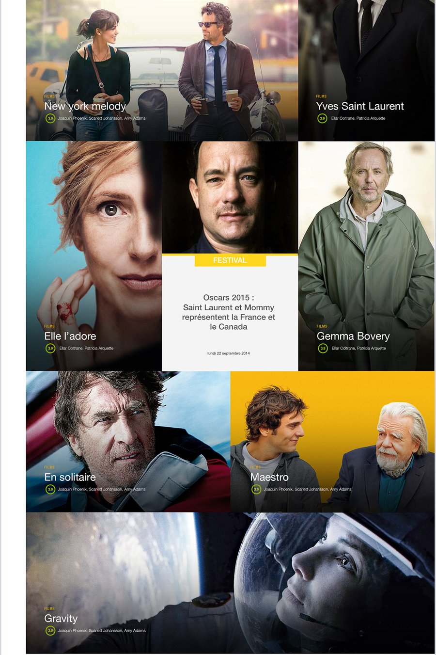 Les films s’agencent les uns par dessus les autres en mosaïque. Certains encarts affichent des informations sur un aplat de couleur: actualités « à la une », nouvelles du dernier festival , liste du dernier box office. La répartition de ces différents aplats donnent du rythme à l’ensemble.