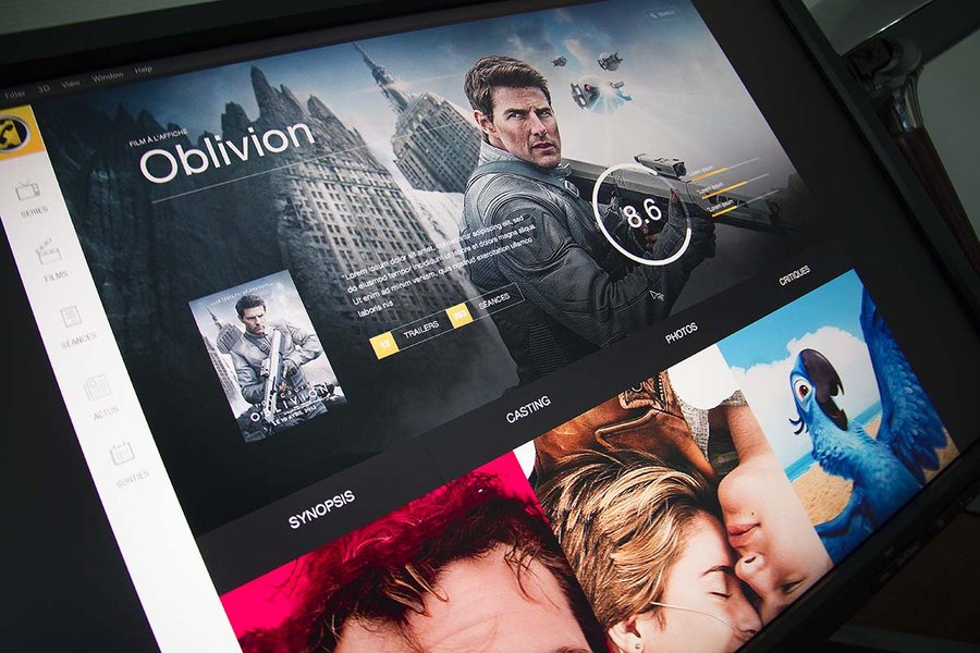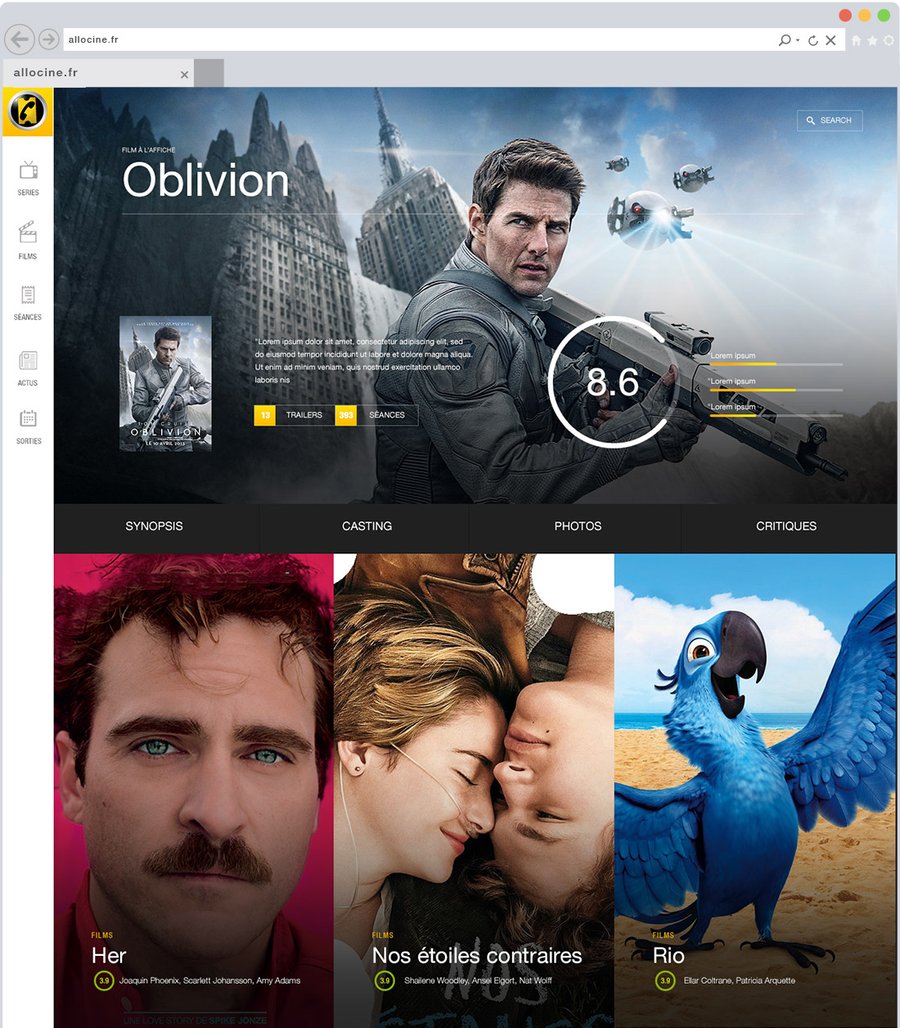 Missionné pour la refonte graphique et visuelle du portail média Allociné.fr. L’orientation du Design valorise ici le contenu du portail par de larges visuels des films, un système de notation et de critique visuel et graphique, un menu latéral pour accéder facilement à tous ses contenus, une mise en page en mosaïque agréable, élégante et structurée.