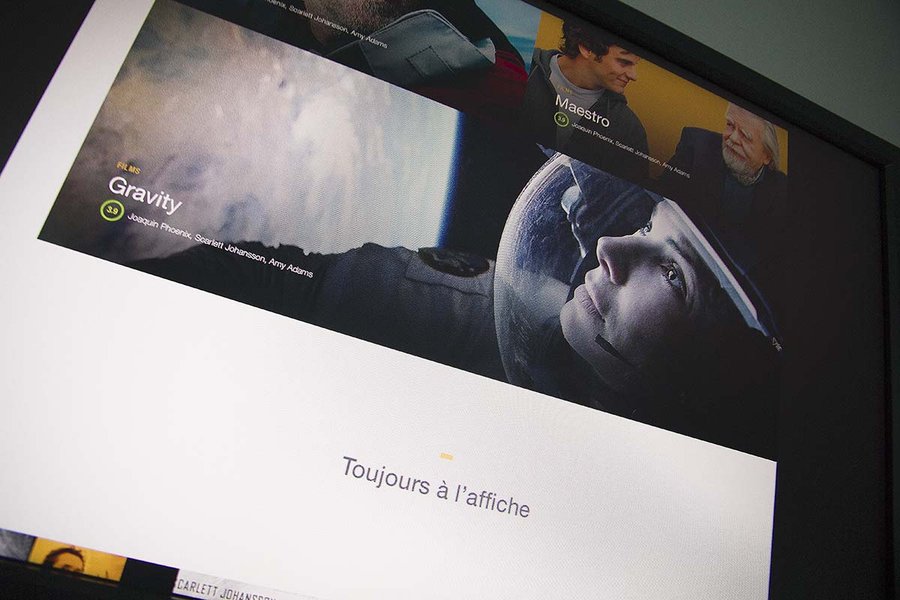L’utilisateur est immergé dans cette mosaïque de films. L’aspect social et communautaire de notation et révision des films est mis en avant par de grandes infographies. Le nouveau Design affiche et valorise les notations par les critiques et le public, le nombre de trailers et de vidéos disponibles, l’heure des séances ainsi qu’un court résumé du film. Le score du film est mis en avant par un grand cercle, rempli et complété en fonction de la valeur du score. L’interface est sobre et élégante pour laisser la part belle aux images.