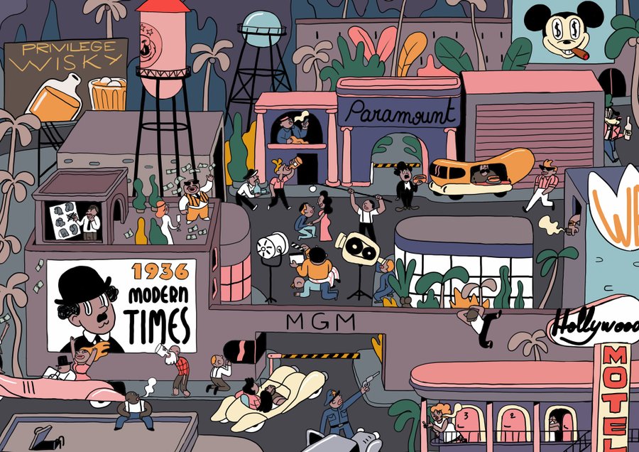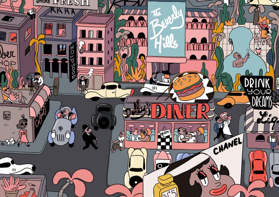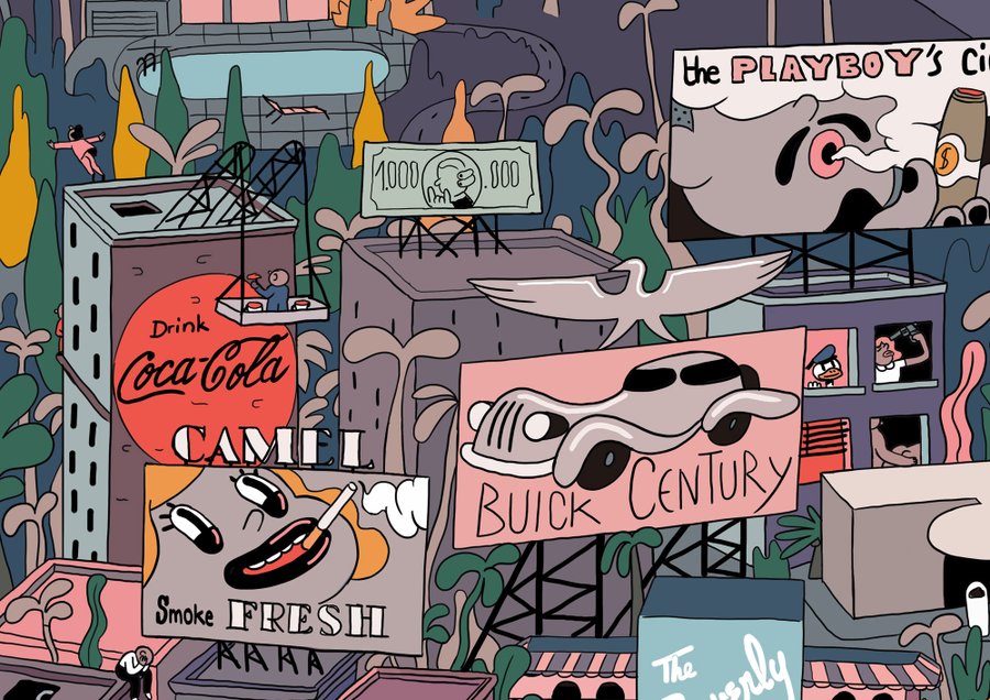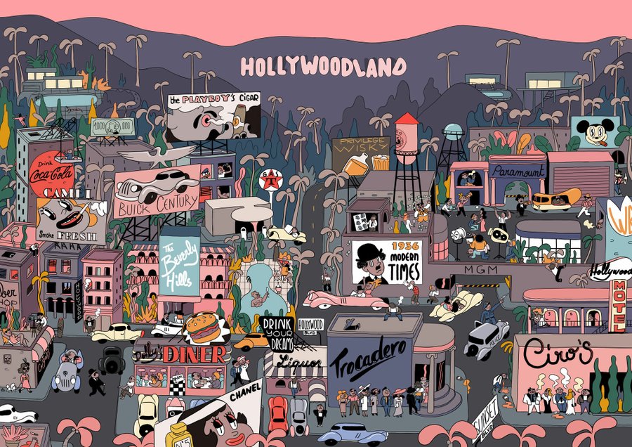 Illustration based on a text from Carlos Rim, presented during the festival Nîmes S'illustre in 2019. A ferocious depiction of the city of Los Angeles back in June 1936 when Hollywood was still Hollywoodland.