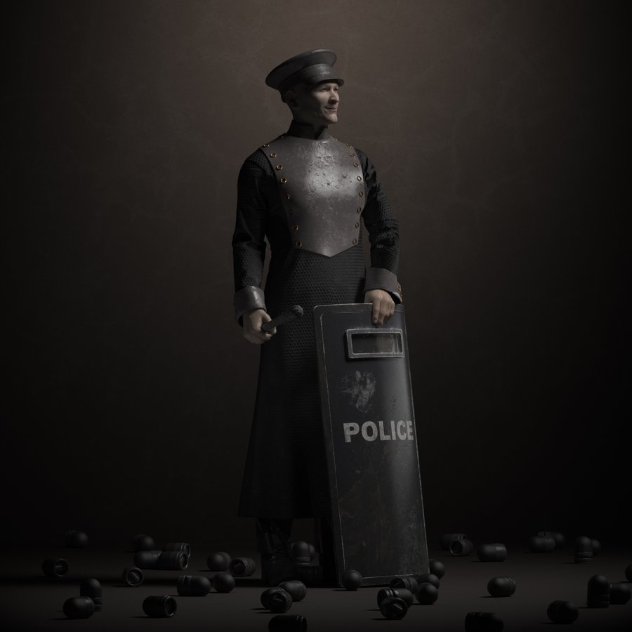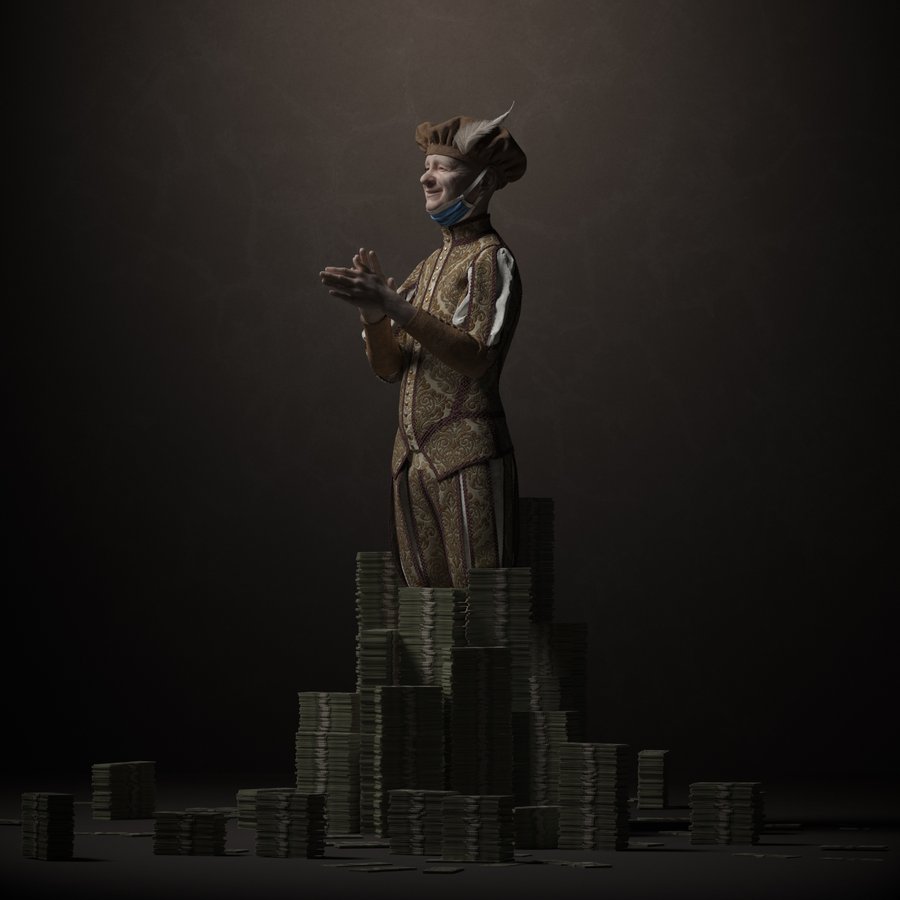 The idea for Vado Mori came from this feeling of hopelessness that I was experiencing at the time. I wanted to make a modern version of the religious altarpiece, but this time centered on Death and its companions: the Leader, the Guard, the Businessman and the Fool. In my Vado Mori, death is not a curse for humanity, it’s a deity to worship, a way to gain more power or money. The only ones who are going to die are the anonymous, the ones who can’t complain and don’t have the choice.