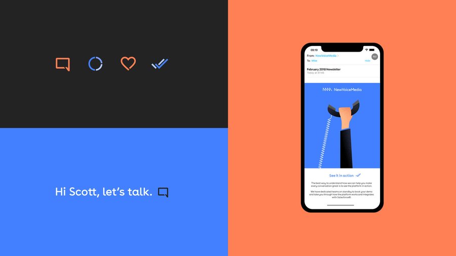NewVoiceMedia helps people everywhere find their voice, making cold calls warmer and difficult conversations easier. When it came to building a new brand, voices were a natural place to start. The graphic waveform reflects the varying frequencies and tones of natural speech, while at the same time acting as a shorthand for the NVM initials. The result is a symbol that serves as a powerful reminder, to both customers and colleagues, of the brand’s important mission.