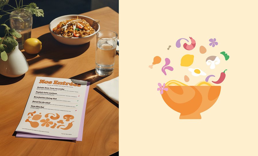 Afin de se démarquer de ses concurrents, ils ont opté pour une identité visuelle inspirée des années 70, un choix audacieux pour un restaurant thaïlandais, mais qui apporte une ambiance funky et colorée.