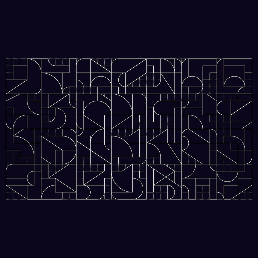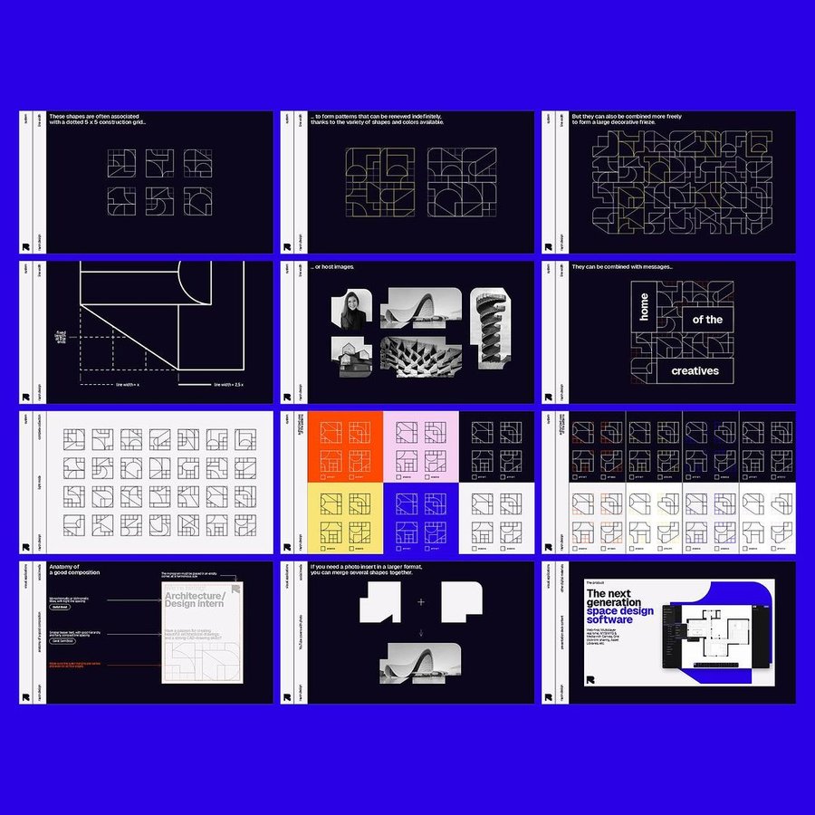 The typogram, built around a logic of perforated blocks, was designed in a way that the pivotal characters, notably the R and Y, were immediately identifiable. A sequential logic between rectilinear and oblique characters on one side (R, Y, N) and round characters on the other (A, O), optically balances the logotype. On this basis, we developed a veritable library of extensive shapes, abstractly evoking the drawing of plans, while respecting the parameters of the logo’s characters.
