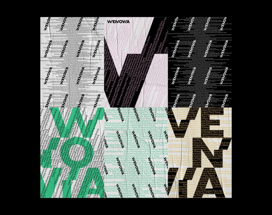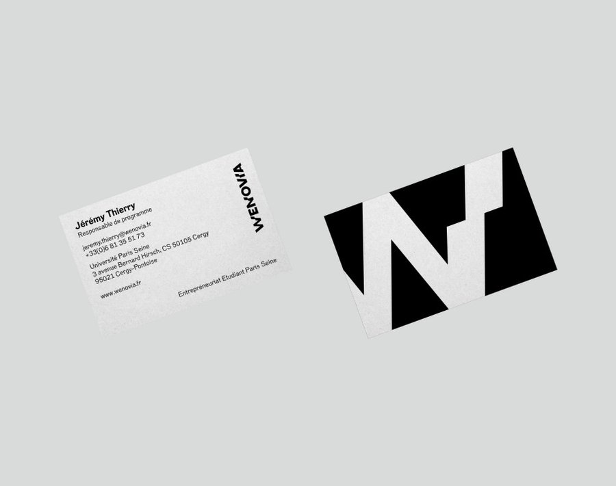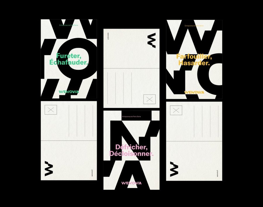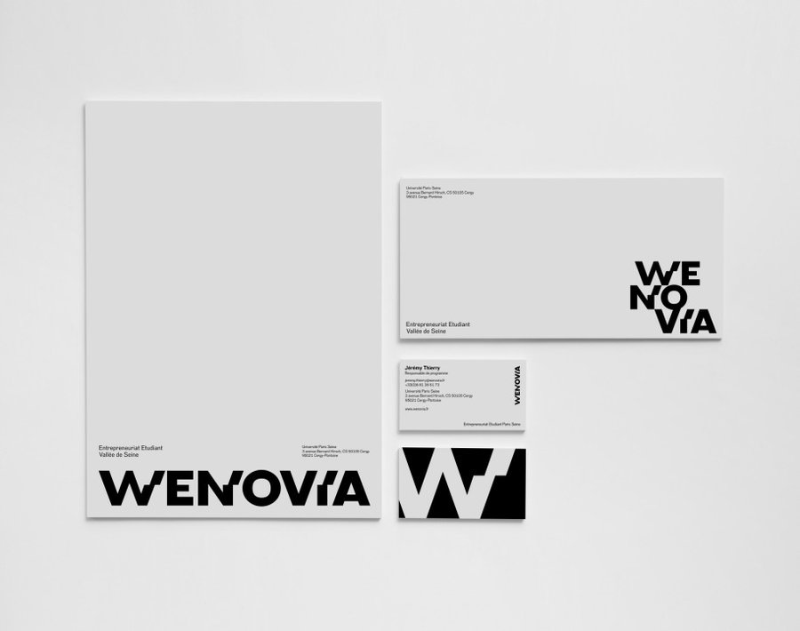 Brand Brothers a été appelé pour traduire l’ambition de ce projet en identité visuelle. La première phase du branding que nous avons travaillé a été présentée aux acteurs du projet et aux élus territoriaux, lors de l’inauguration du coworking Wenovia de Cergy-Pontoise en février 2018. Le logo Wenovia est une création typographique originale. Composé de caractères haut de casse, épais et solides, il comprend 3 éléments décalés au sein même du dessin des lettres, faisant référence à la fois au « pas de côté » prôné par la démarche, mais également au style architectural brutaliste du fief de Wenovia, Cergy-Pontoise (et notamment sa préfecture en forme de pyramide inversée). Nous avons développé un territoire graphique sobre et structuré, en écho avec le radicalisme graphique du logo, qui sera amené dans les mois à venir à prendre de l’ampleur sur différentes applications physiques, print et web.