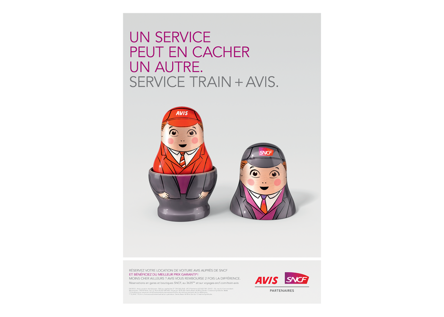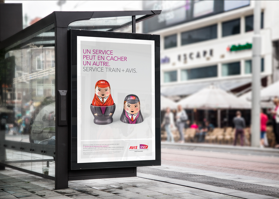 Réalisation d’une campagne d’affichage pour le service TRAIN+AVIS, partenaires Avis et SNCF