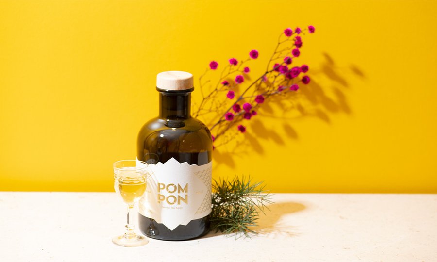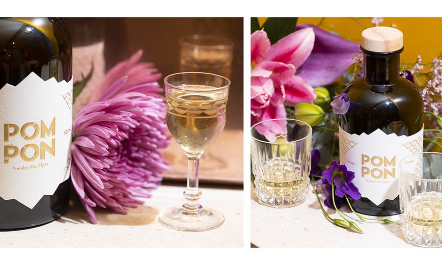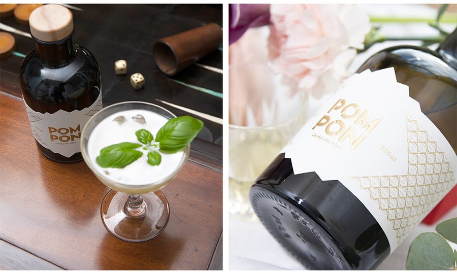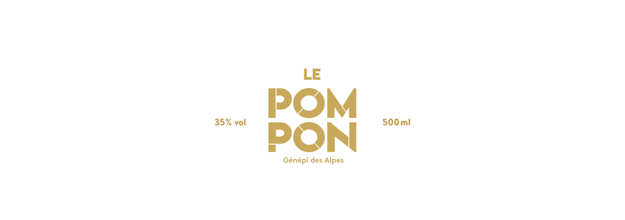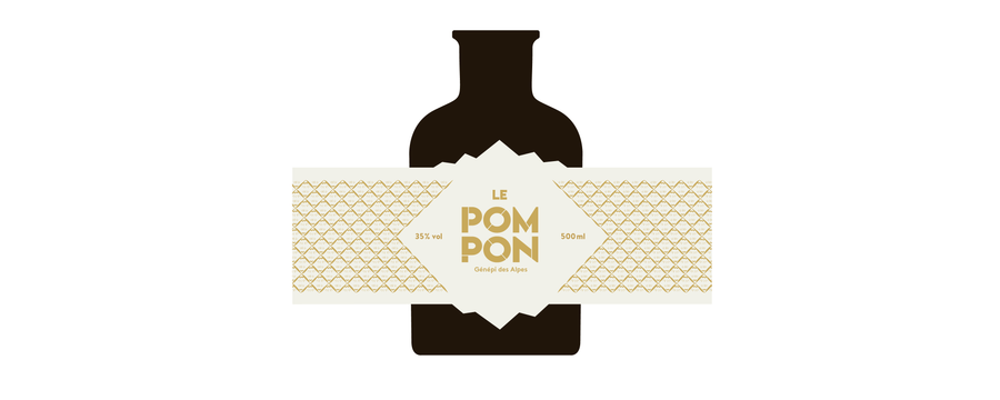 Création et design d'une bouteille de génépi "le Pompon". Le but était de rompre avec les habitudes de représentation du génépi, à savoir une bouteille clair, allongée avec un brin à l'intérieur.