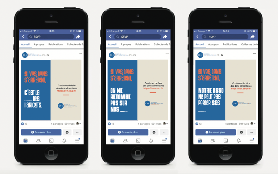 Campagne de marketing direct pour un appel aux dons mettant en avant l’utilité de chaque don, suite à une baisse d’aides alimentaires. Trouvez le double sens des accroches sur les réseaux sociaux.