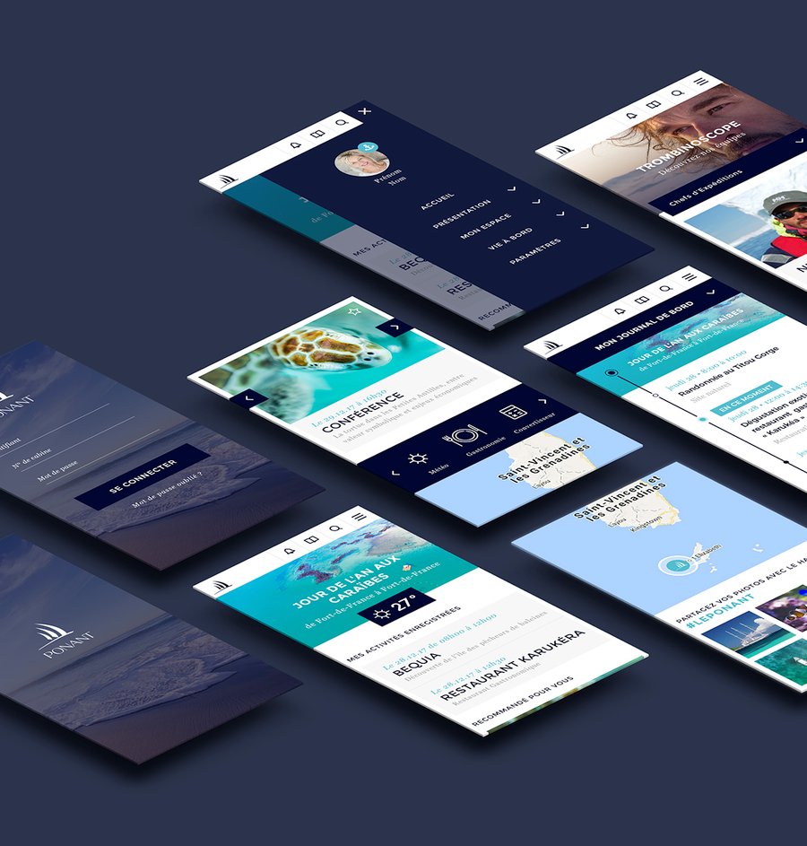L’application PONANT est destinée aux croisiéristes afin de les accompagner avant, pendant et après leur voyage. Toute la difficulté de la conception UX réside dans le fait que les contenus proposés sont différents selon si l’utilisateur consulte l’application sur terre ou en pleine mer. Chacune des deux options propose un parcours utilisateurs différents.
