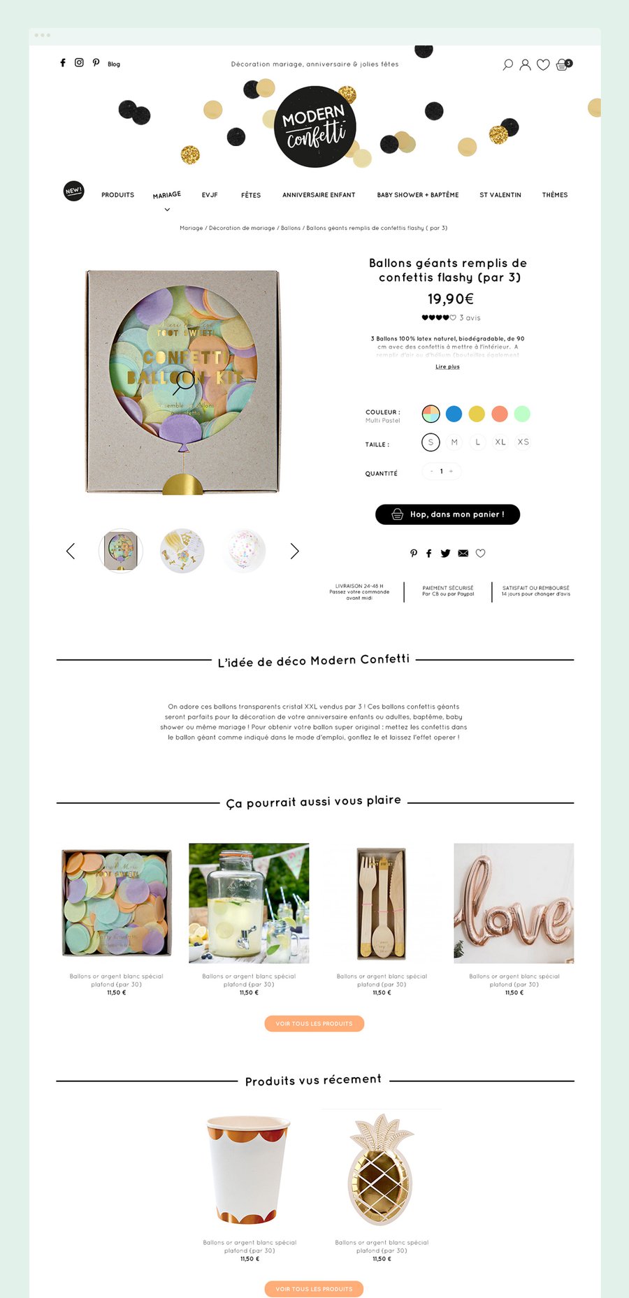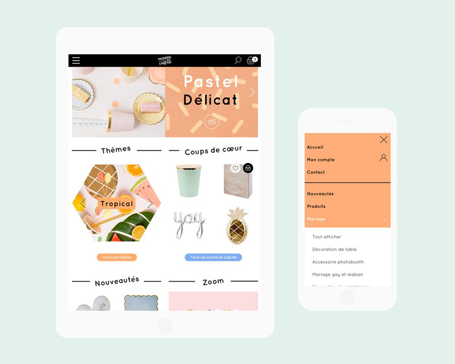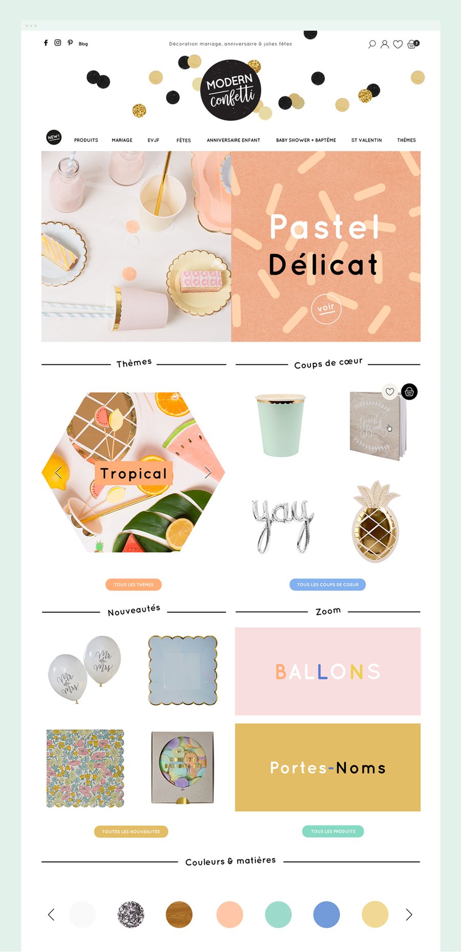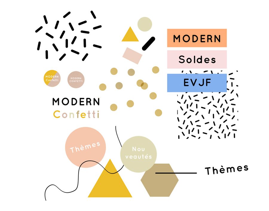 Direction artistique, UX et UI, illustrations, refonte du logo pour le site de vente de décoration de fête en ligne Modern Confetti