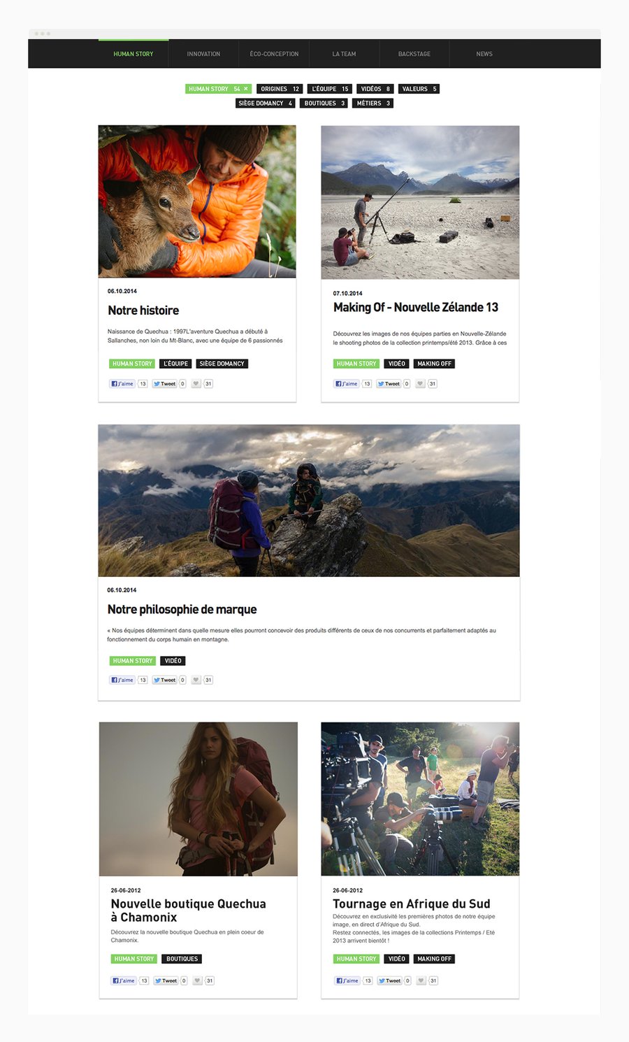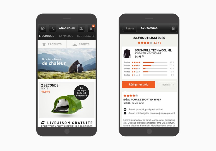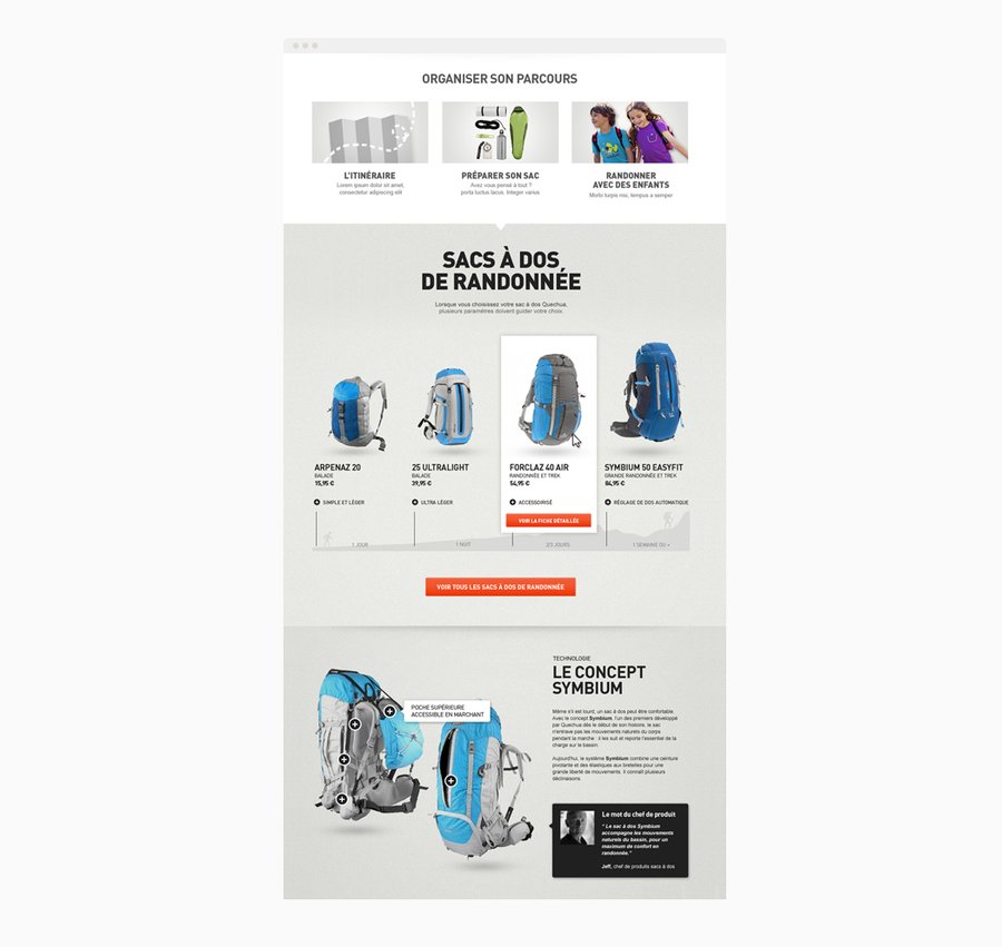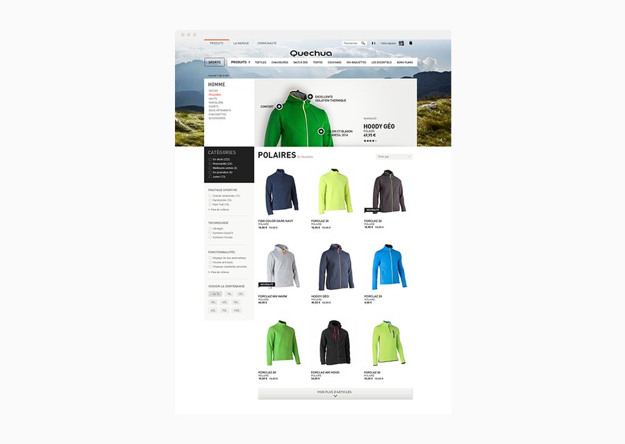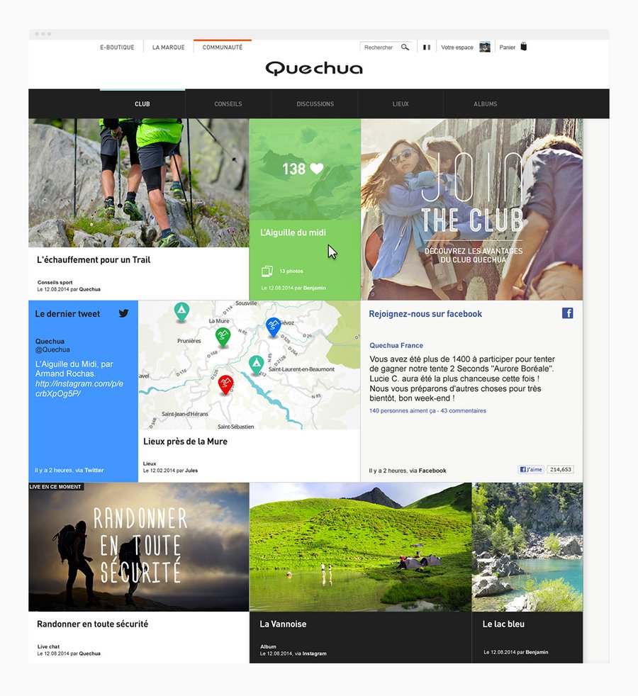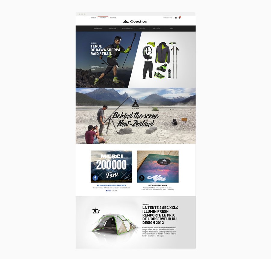 Direction artistique pour les différents sites de la marque de sport de montagne Quechua, site e-commerce, site de marque, site communautaire. Illustrations, design de pictos. Desktop et mobile